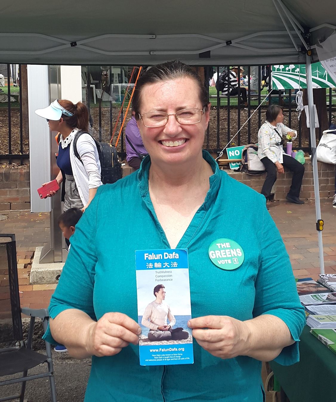 当地绿党成员吉尔· 哈特利(Jill Hartley)女士表示:上个月我在悉尼海关大楼前看见法轮功学员在集体炼功,他们展示的功法、那场面简直太壮观美丽了,我看到有许多人观看和赞美他们,就像我一样想表达对他们的感谢,因为他们真是太美了、太让人感动了。法轮功知道真理是什么,法轮功按照真、善、忍宇宙法理和普世价值修炼。他们对社会的影响力特别好。