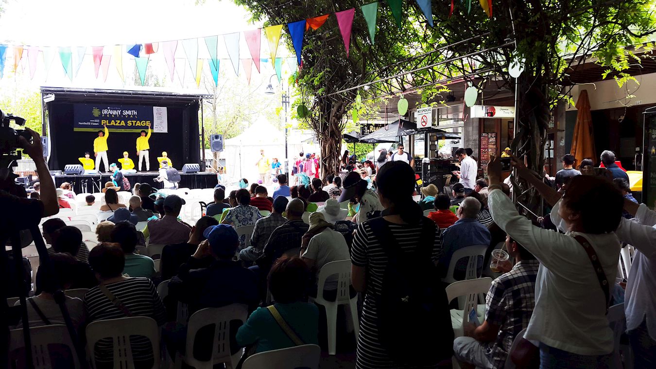 当天游行结束后,法轮功学员应邀在最大的庆典舞台上做功法演示。身着金黄色炼功服的学员们演示了法轮功的五套功法,西人法轮功学员在一旁为东西方观众讲解每一套功法的特点及功理。他还介绍说:法轮功是一种古老的修炼方法,简单易学,修炼法轮功令人身心受益。法轮功已在全世界一百多个国家和地区弘传。欢迎大家前来了解和修炼法轮功,每天早上六至八点在伊斯特伍德公园(图书馆旁边)有免费教功。