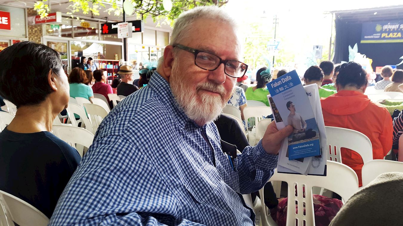 坐在观众席中的加里·查姆斯(Gary Chams)从头到尾看得特别仔细,他表示:我准备到附近公园去向他们学习修炼法轮功。因为我感受到他们展示功法时能量场非常强大,而且他们很祥和善良,我很想和他们一起修炼法轮功。