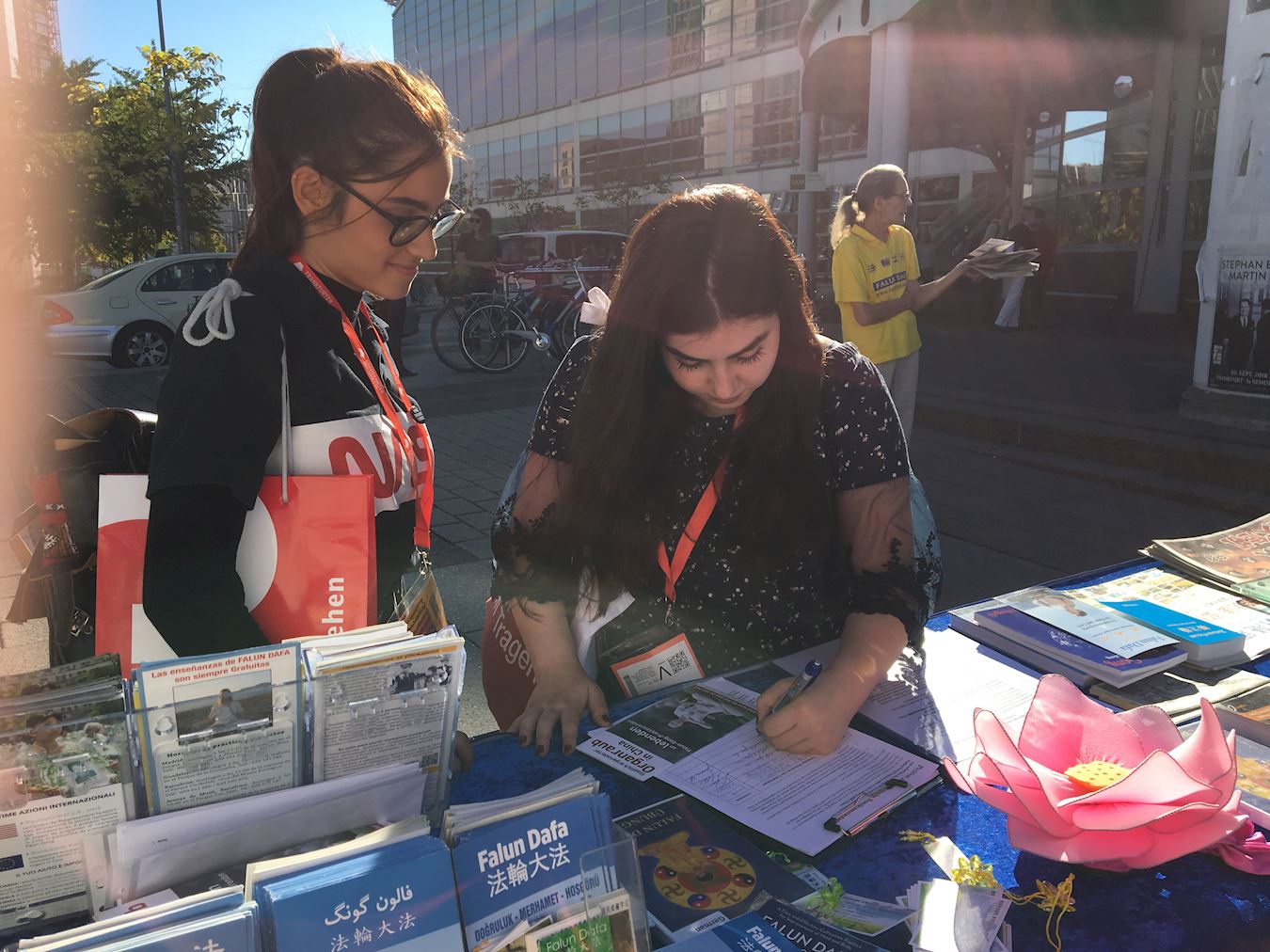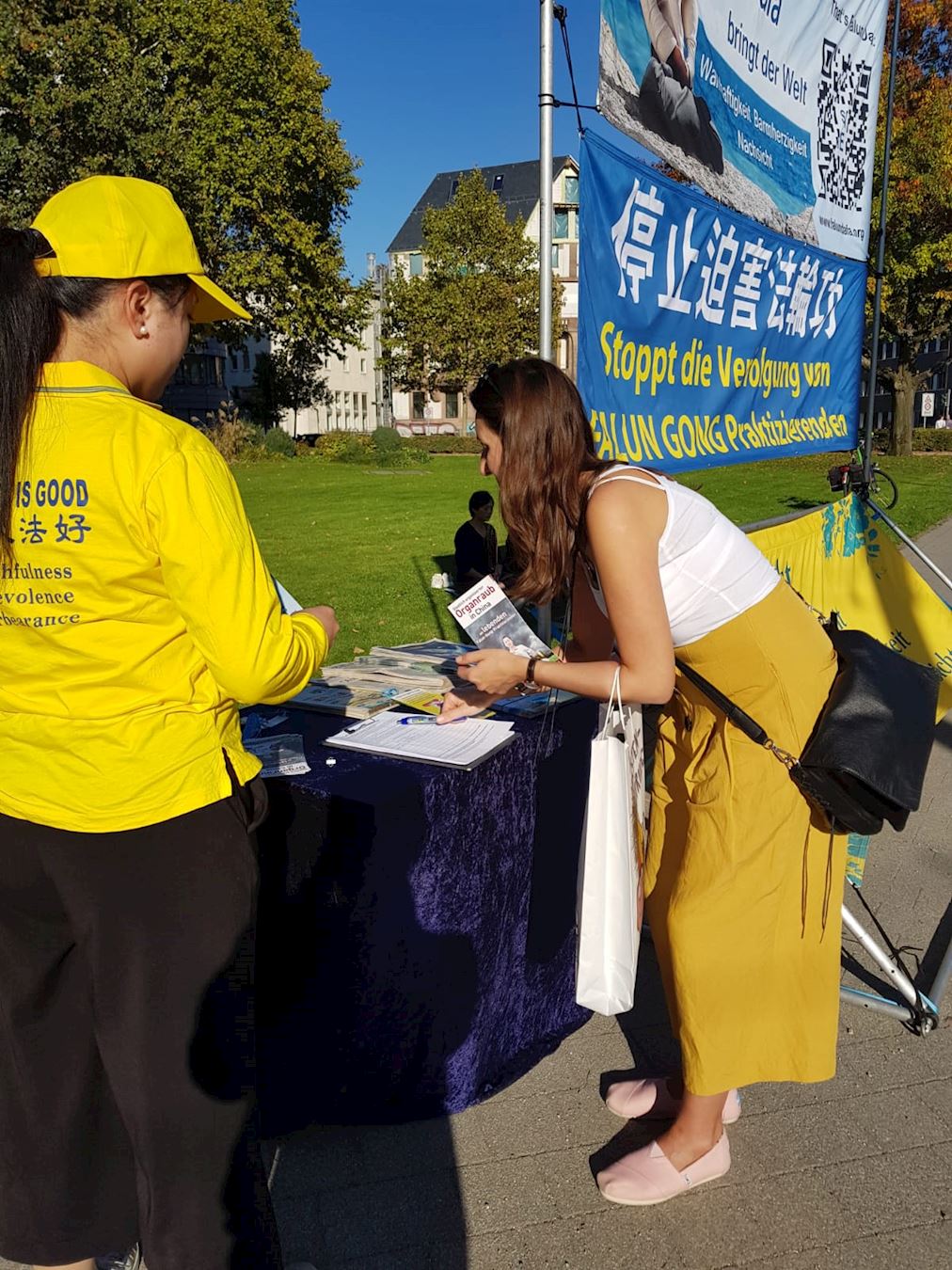 书展期间,法轮功学员每天在展会主馆前广场的书市上和附近的交通要道旁,以及在市中心最繁华的柏林大道边同时举办法轮功咨询活动,不同民族、不同国家的参观者、游人以及德国各地民众都有机会了解到法轮大法的美好以及中共十九年来残酷迫害法轮功学员的真实情况,其中不乏中国人。