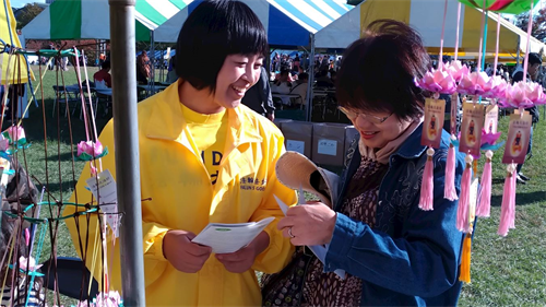 交流节包括舞台表演和各种展示以及娱乐活动等,现场人来人往,络绎不绝。法轮功学员在舞台上表演了中国传统的腰鼓舞和法轮功的五套功法动作,台下很多观众跟着学炼了起来,也有很多海外华人带着敬佩的目光观看法轮功学员的演出。其中,一位从大陆探亲来的教师对法轮功学员表示:“我有几位学习法轮功的同事,这些年(在中共的迫害中)都受到了很大的冲击,被停职、停发工资。我觉得在国内对你们太不公平了,你们都不容易。”