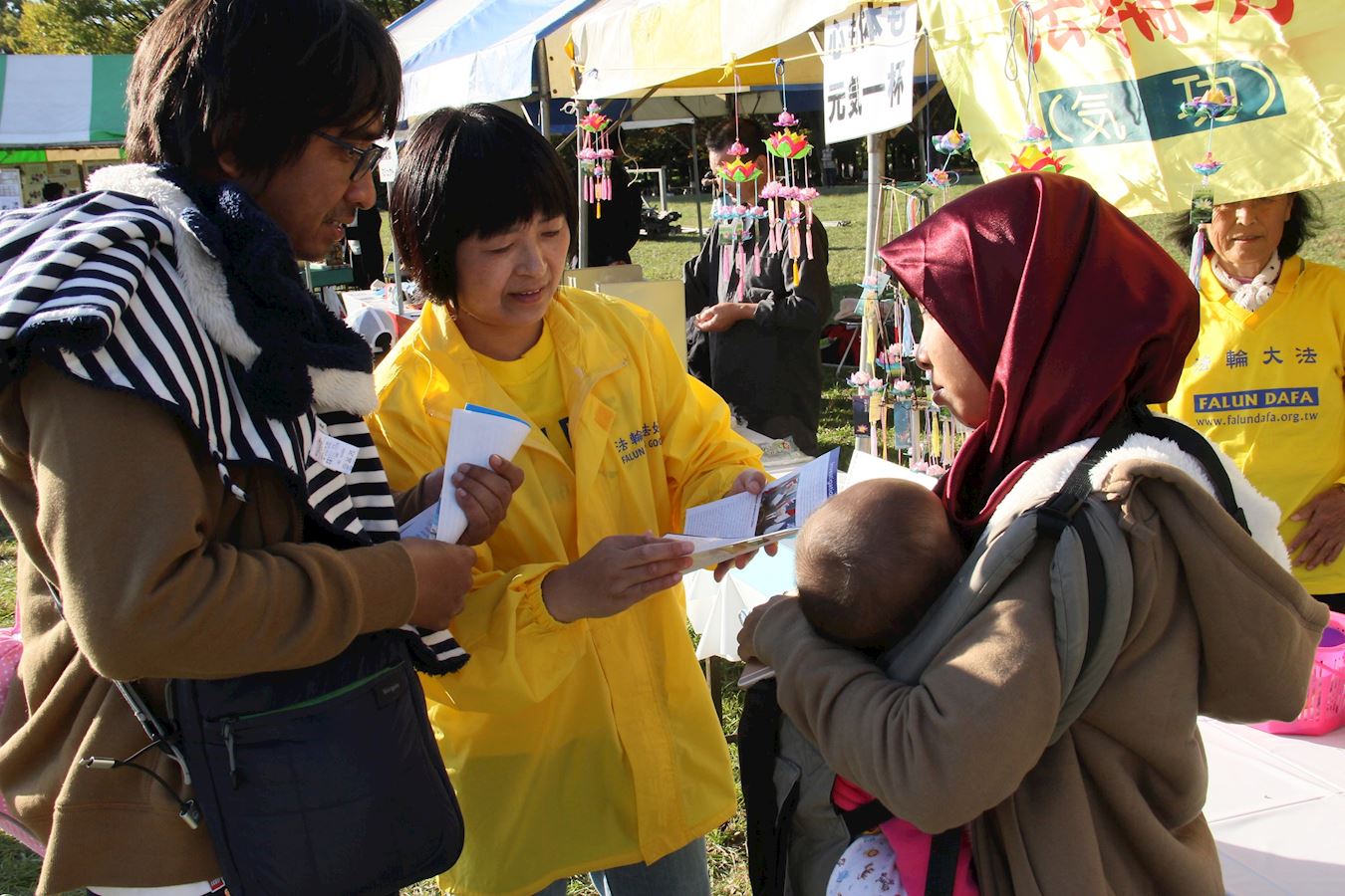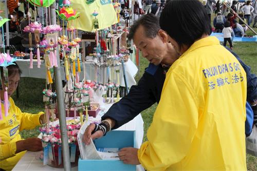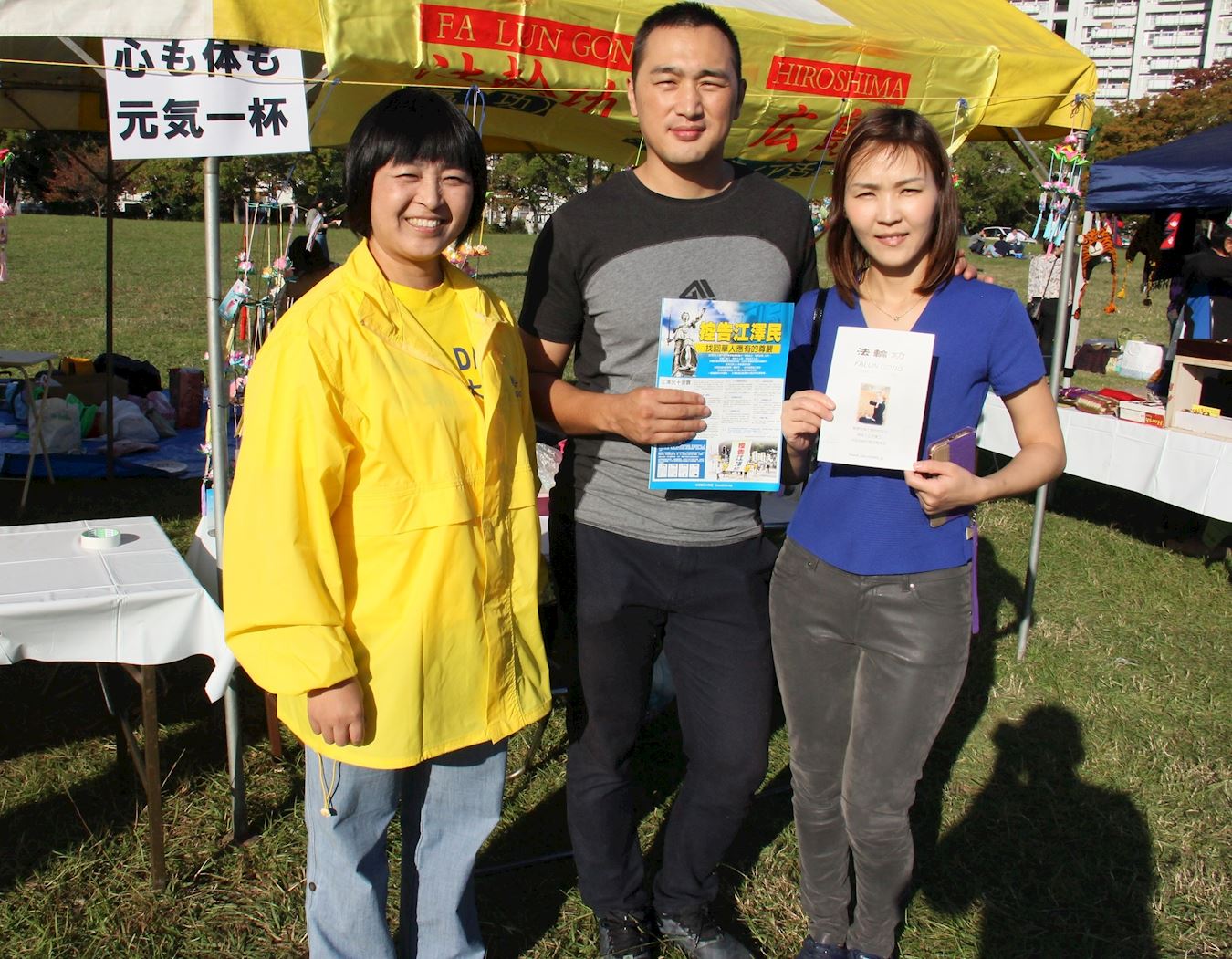 先后有几位游客一听说是法轮功,就说:“法轮功,我经常在和平公园看见你们。”并表示今后也要学炼。有一位女士来到展位前说:“我昨天还在想,我好象应该学点气功,我今天就真的碰到气功了。”她记下了法轮功学员的联系方式。还有一位女士说:“看起来很不错,只是我住在广岛北,离这较远,学起来不方便。”法轮功学员告诉她,在广岛北附近的可部公民馆有免费教功,明天就有。那位女士详细确认时间后,表示明天就去学功。