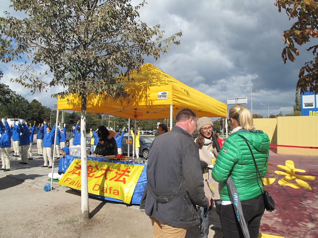 真相点设置在通向美泉宫入口道路一侧,法轮功学员的集体炼功和真相横幅吸引人们的目光,一些游客上前与法轮功学员交谈深入了解真相。当天有一群群大陆游客来游览美泉宫,其中有些对着真相点拍照,有些驻足观看,一些游客接过法轮功真相资料。