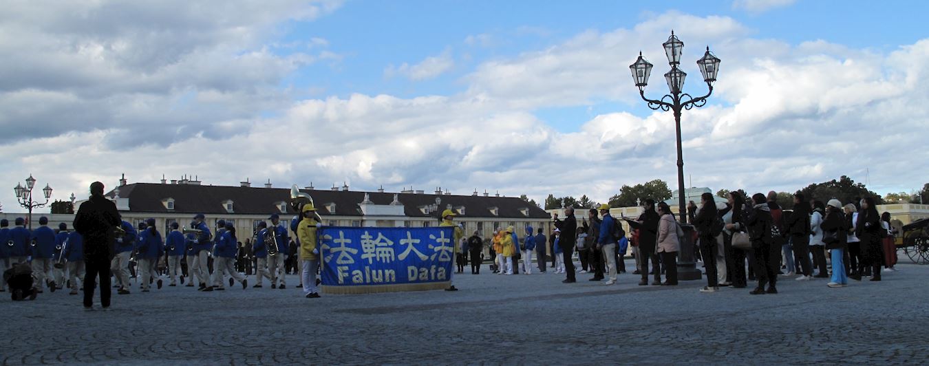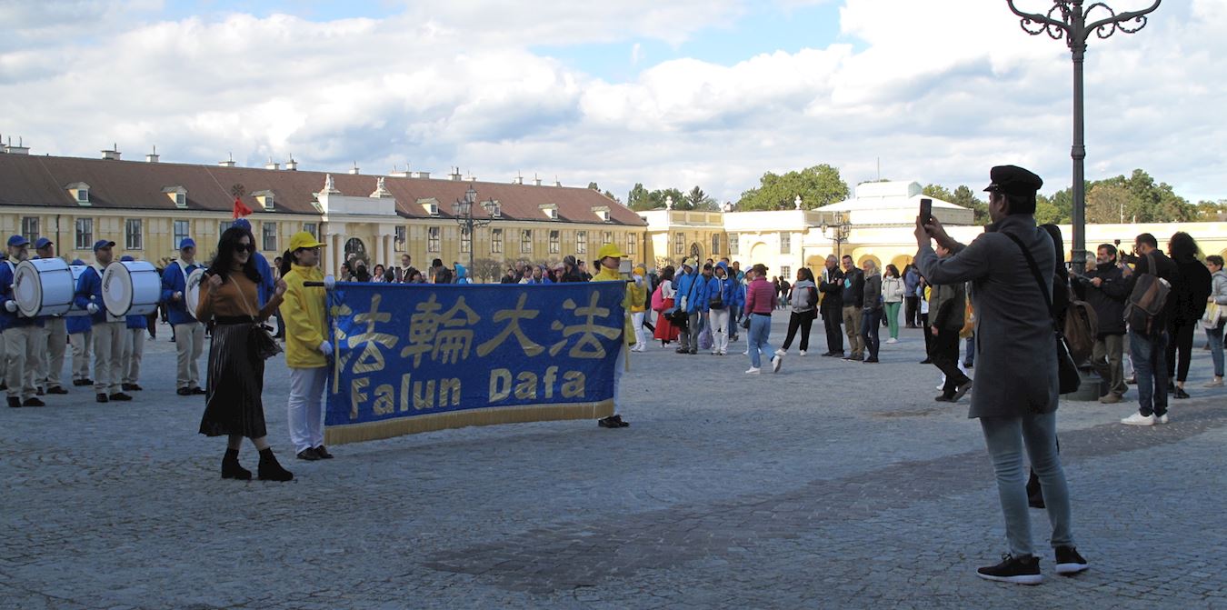 二零一八年十月二日中午时分,在著名的维也纳美泉宫(Schloss Sch?nbrunn)广场内外,奥地利法轮功学员又一次来到皇宫大门外设立法轮功真相点,向来自世界各地的游客展示法轮大法的美好、揭露中共对法轮功的迫害并发出要求中共停止迫害法轮功的呼声。