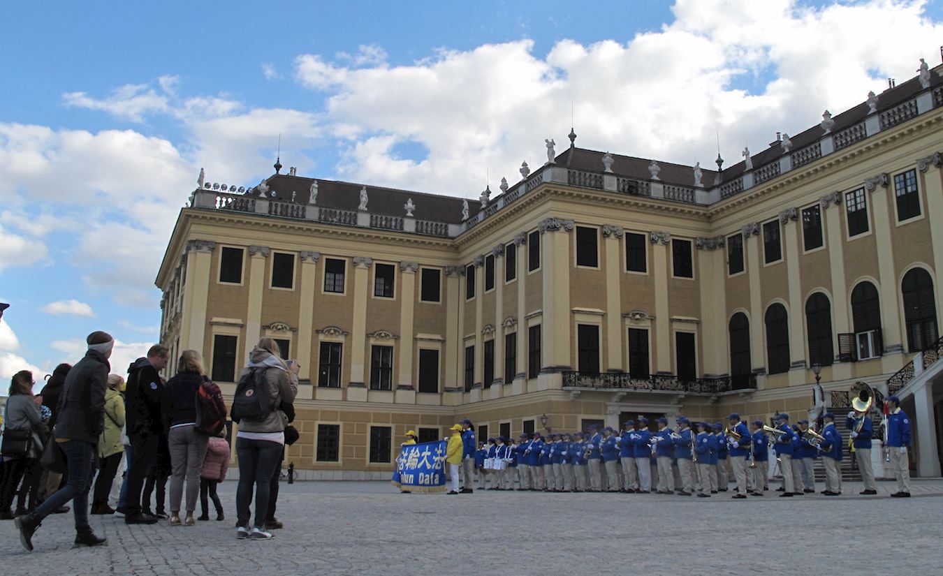 ![]() 图3:二零一八年十月二日, “欧洲天国乐团”在著名的维也纳美泉宫(Schloss Sch?nbrunn)广场演奏《法轮大法好》等乐曲,吸引震撼国际游客 |
