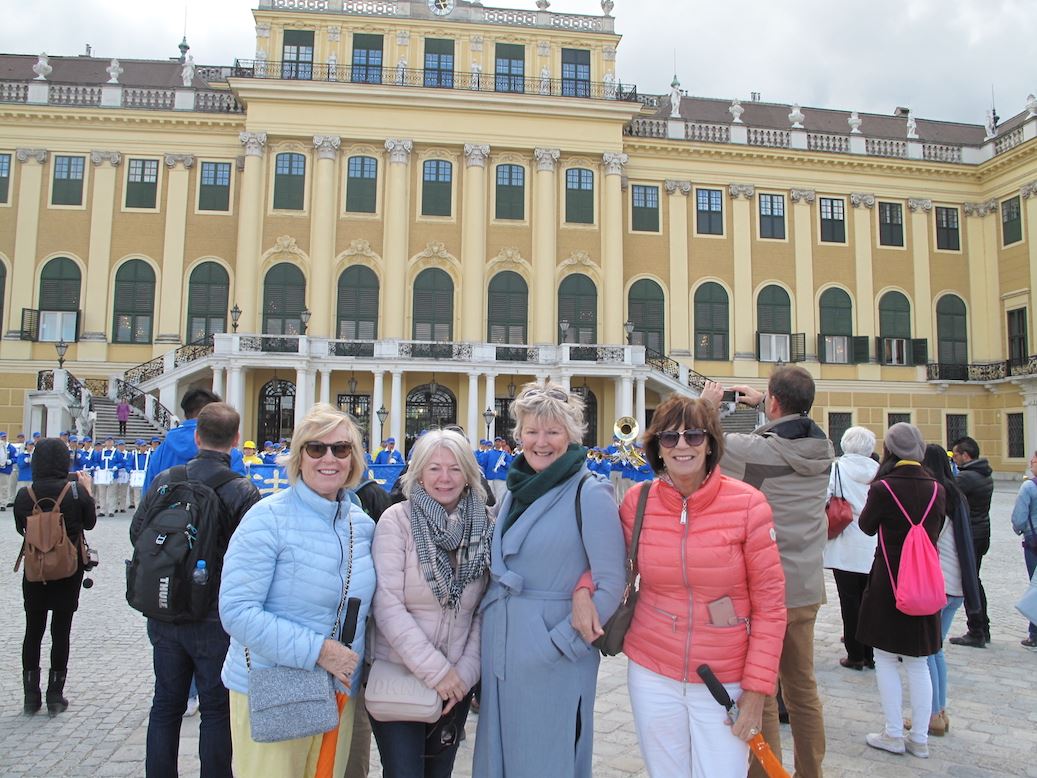 在美泉宫广场上,四位正在进行“维也纳一日游”的爱尔兰女士认真聆听天国乐团的演奏,她们表示非常高兴遇到了“天国乐团”,她们当中有人听说过法轮功,看到“法轮大法”横幅后主动向听众人群中的法轮功学员询问了解真相。