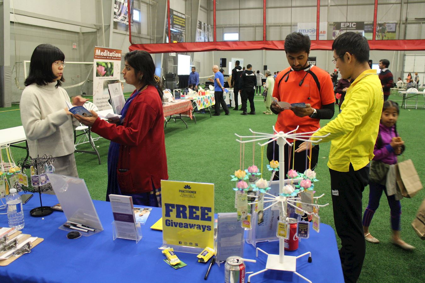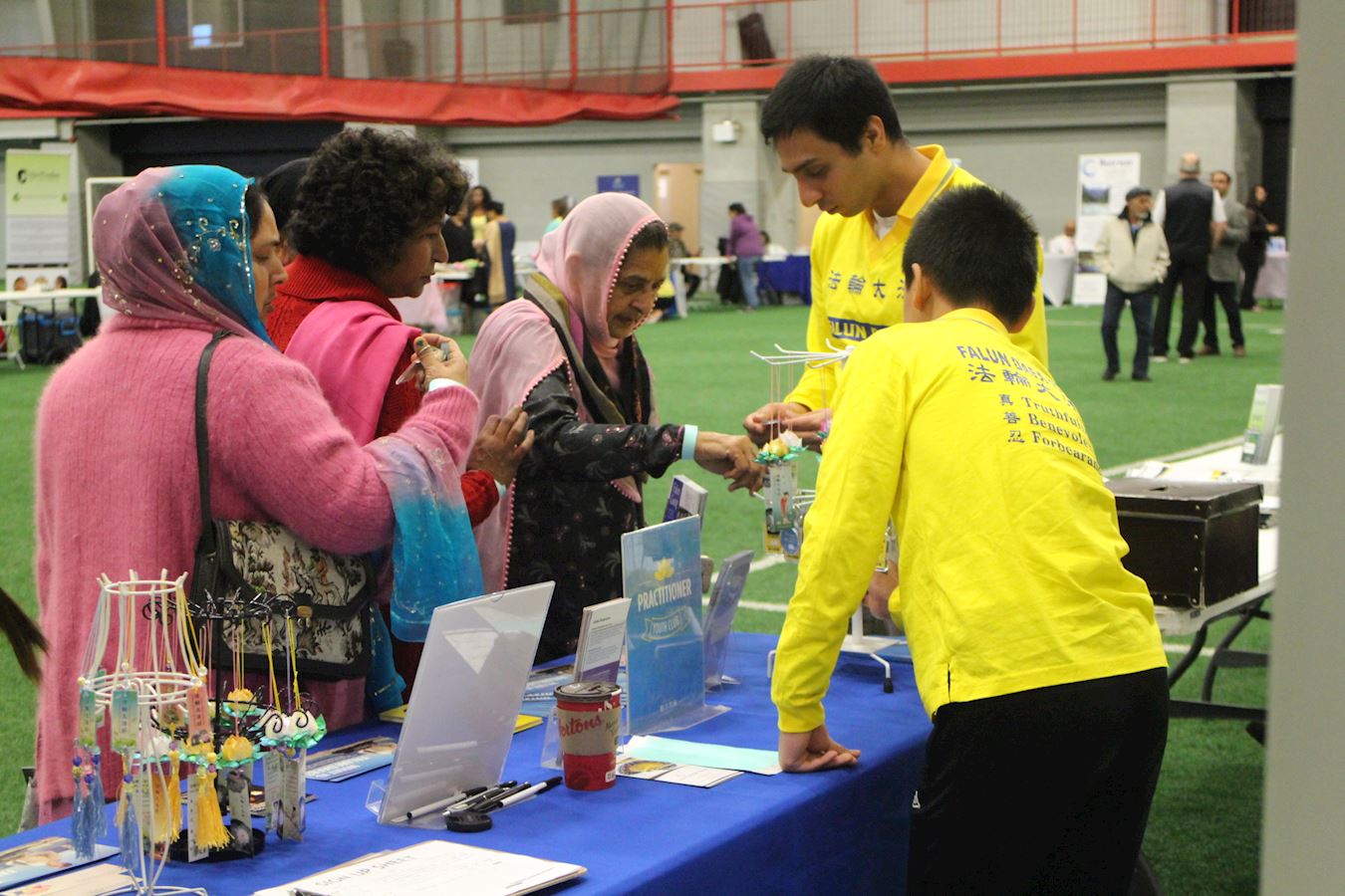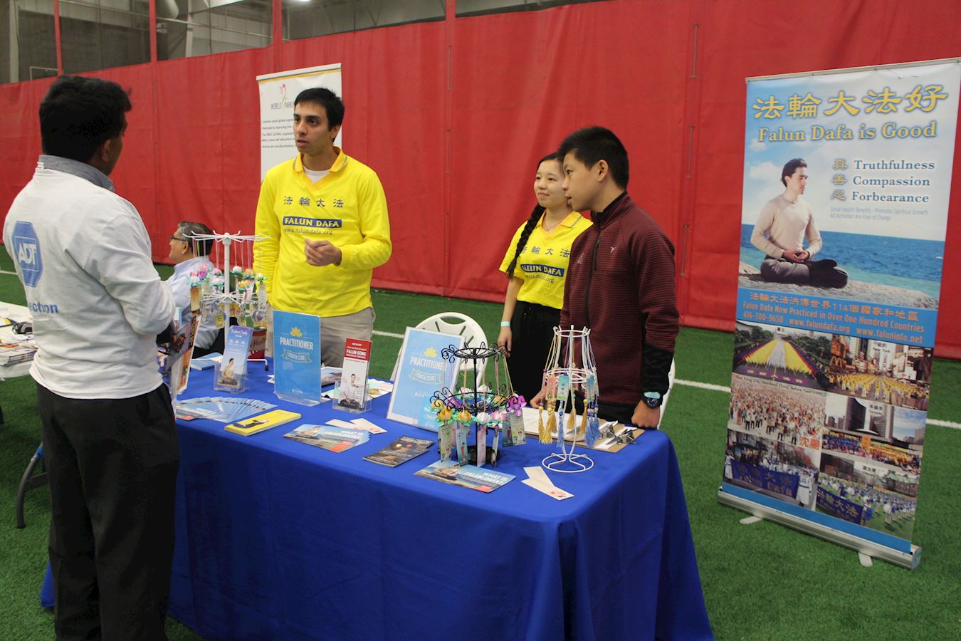 德万(Devan)来到法轮功展位,说自己很想了解这个功法。学员给他介绍了法轮功的特点,修炼者按照“真善忍”原则做好人等。德万问,“忍”是什么意思,学员解释说,“忍”包括忍受、忍耐等意思。德万表示非常赞同:“对啊,现在的人总是说这个也不好, 那个也不好,我感觉其实这样不好,没有忍耐。”德万表示自己很有兴趣了解并学炼法轮功。