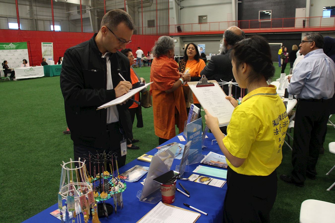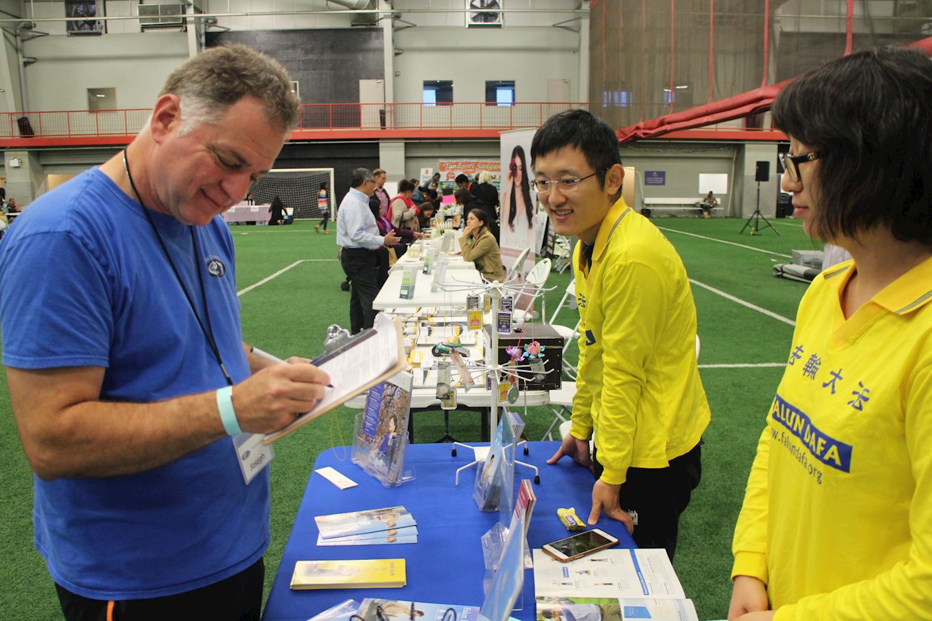 马立克(Marek)看到法轮功展位时主动走过来询问:“你们是在加拿大修炼吗?”学员给马立克介绍了法轮大法弘传全世界一百多个国家和地区,并介绍了功法特点和“真善忍”修炼原则。听完学员的讲述,马立克马上报名参加法轮功的“九天学习班”。