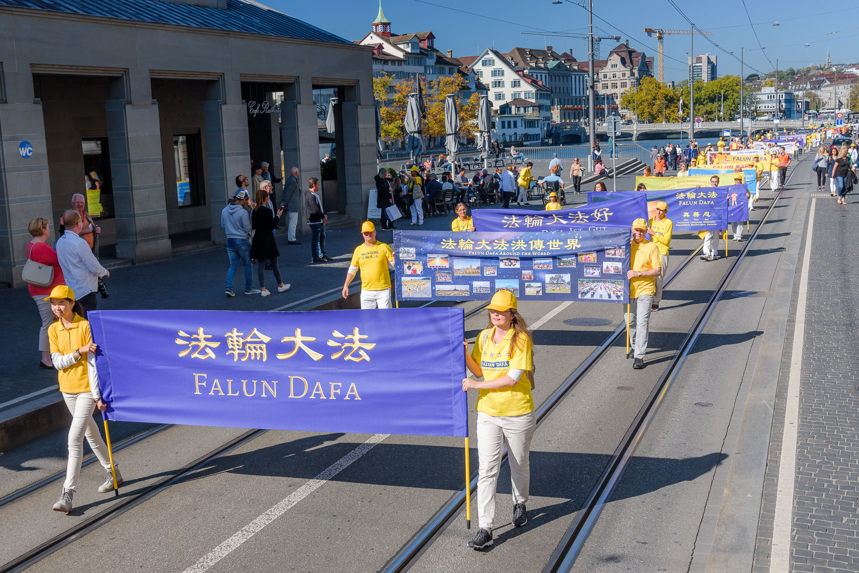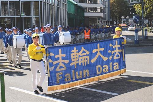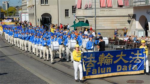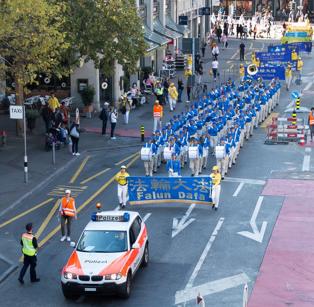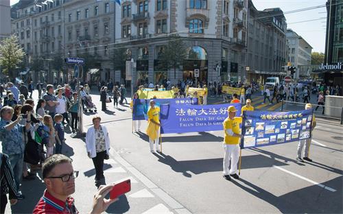 法轮功的游行队伍从苏黎世的海尔维广场(Helvetiaplatz)出发,穿过苏黎世市中心,沿着利马特河畔到达布克利广场(Bürkliplatz)的市政府公园(Stadthausanlage)。有的路人拿出手机记录这一特殊的场景,有的则仔细阅读拿到的传单,想更多了解法轮功。有的则非常惊讶,法轮功学员可以在工作日拿到游行的许可,他们知道在苏黎世得到这样的许可是非常不容易的。
