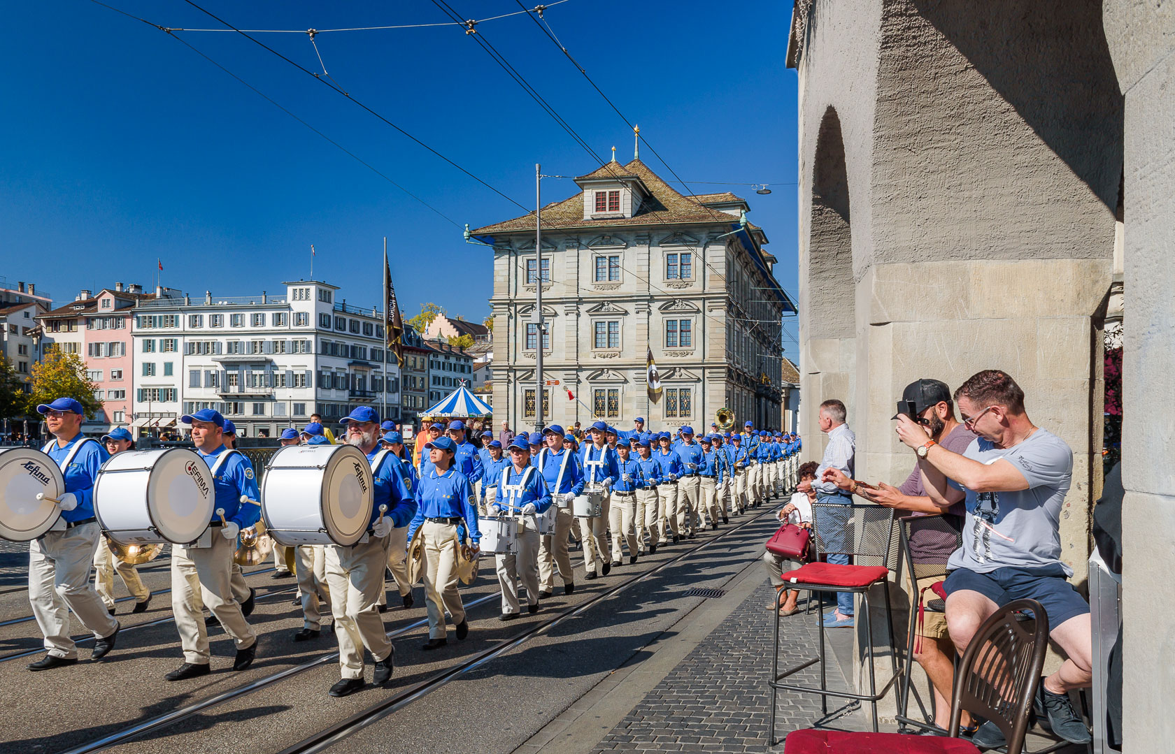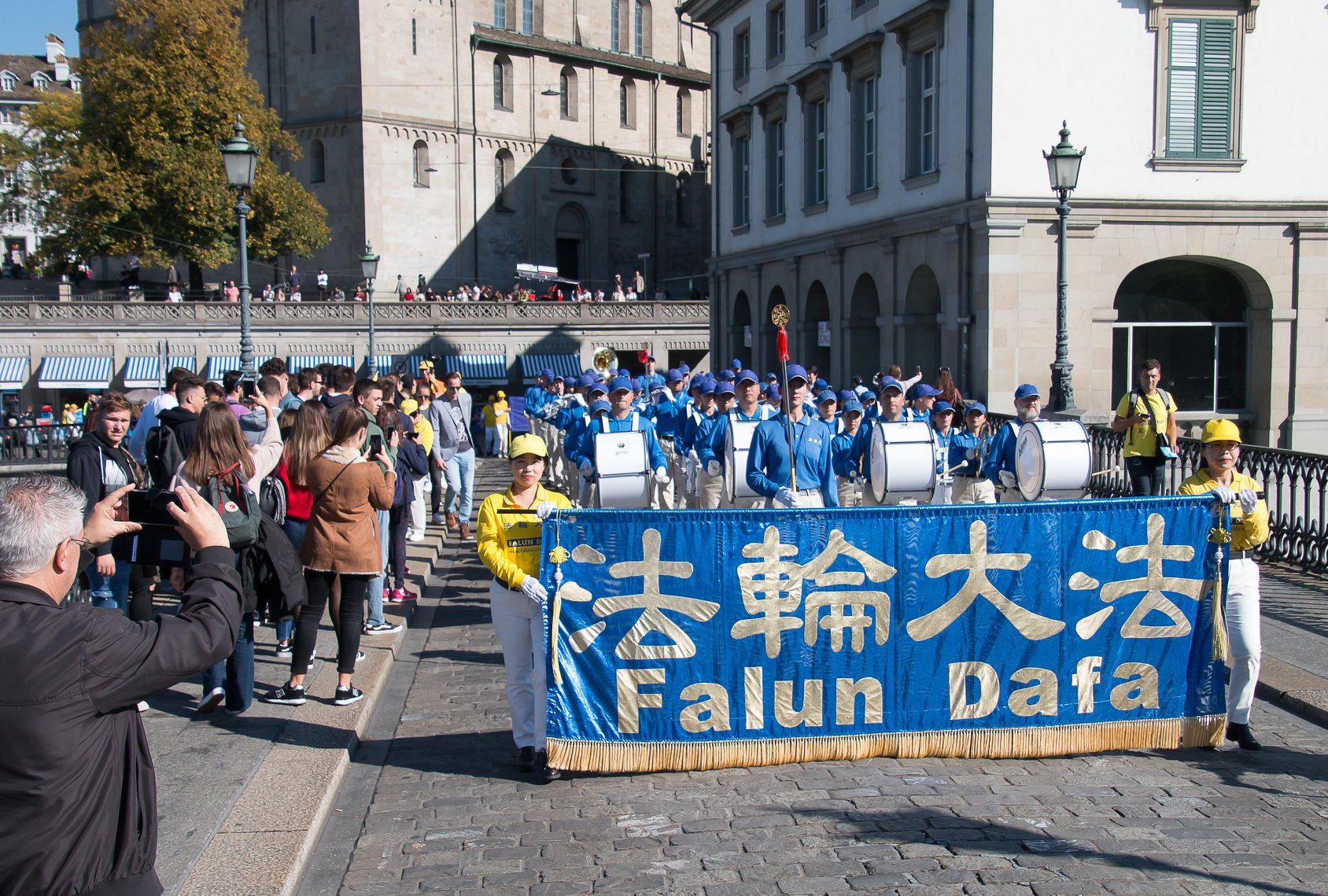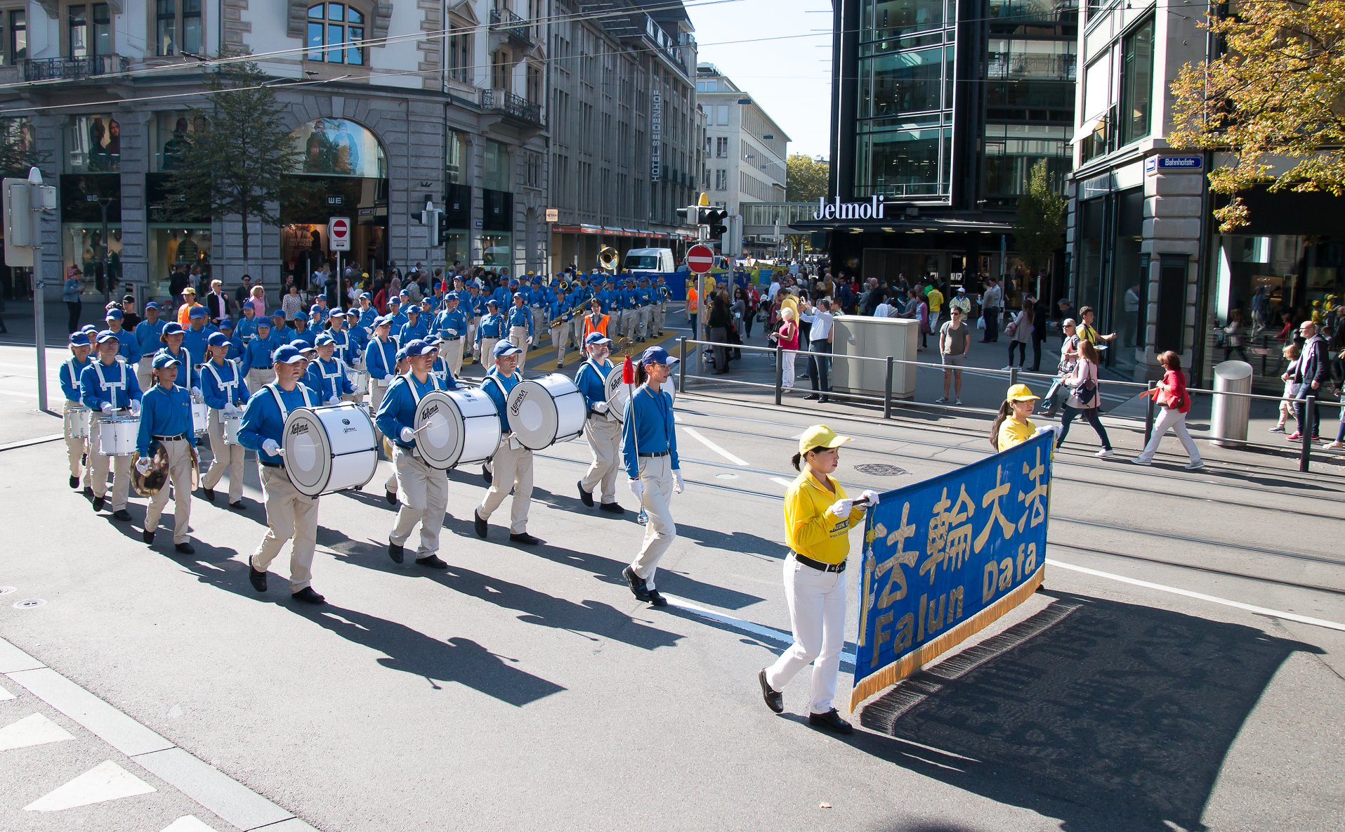 法轮功的游行队伍从苏黎世的海尔维广场(Helvetiaplatz)出发,穿过苏黎世市中心,沿着利马特河畔到达布克利广场(Bürkliplatz)的市政府公园(Stadthausanlage)。有的路人拿出手机记录这一特殊的场景,有的则仔细阅读拿到的传单,想更多了解法轮功。有的则非常惊讶,法轮功学员可以在工作日拿到游行的许可,他们知道在苏黎世得到这样的许可是非常不容易的。