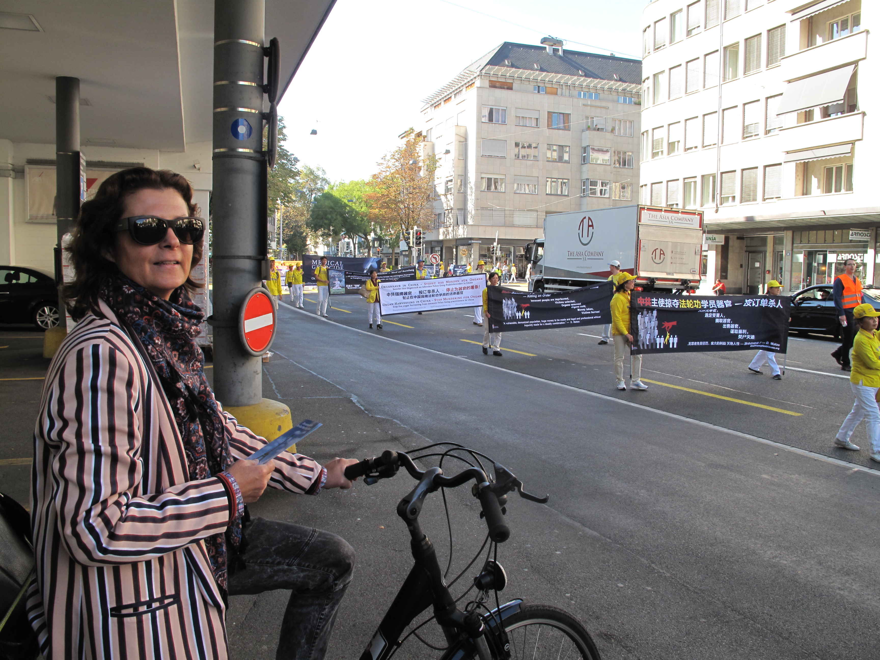 当游行队伍经过苏黎世一家媒体机构时,正要骑车离开的女记者尼克尔(Nicole)停下认真观看从眼前的一系列真相横幅,上面用中英德三种文字写着:“法轮大法好”、“法轮大法在瑞士”、“停止迫害法轮功”、“中共强摘器官-按需杀人-停止为器官的谋杀”等等。