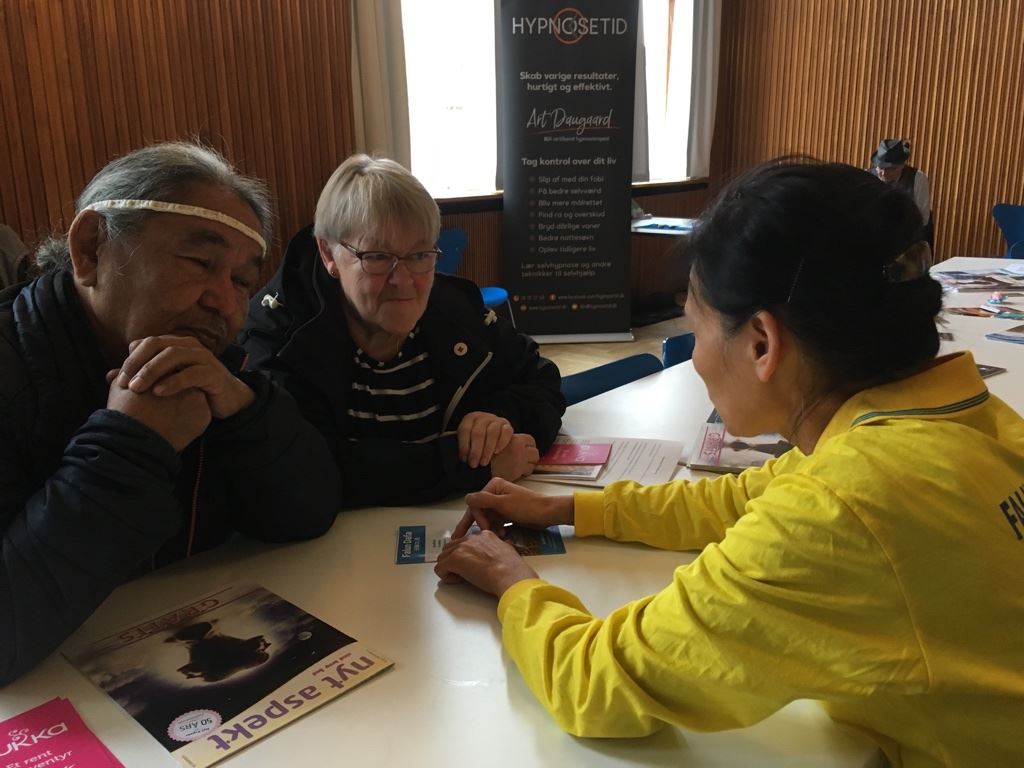 来自格陵兰岛的约库姆什(Jokumsen)夫妇,看着法轮功学员炼功,感觉到非常优美祥和。学员告诉他们,法轮功是一种来自东方的传统修炼方法,按照真善忍指导修炼,能够达到身体健康,道德升华。