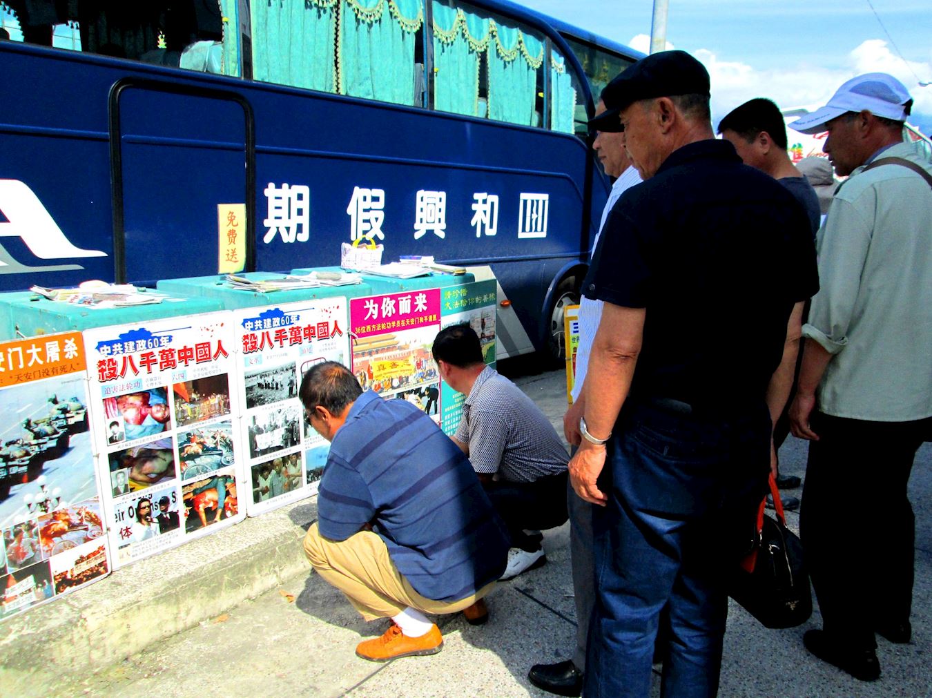 有一次,在一群人上车前,义工忙着发真相报,有个中年人说:“发这干啥?只有共产党,才有新中国。”义工笑着大声回应:“大哥,说反了,应该是没有共产党才有新中国吧!”准备排队上车的一大伙人全哈哈大笑起来,有人边笑边竖起大拇指,整车的人开心的拿着真相资料离去。