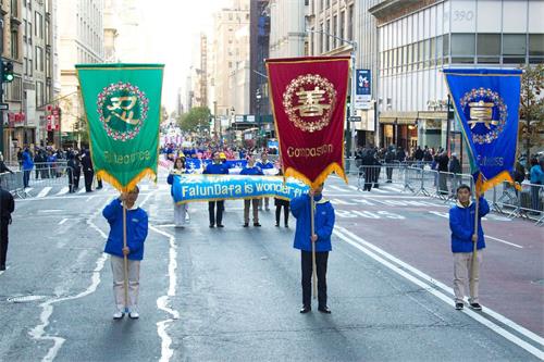 由法轮功学员组成的天国乐团、彩旗阵、莲花船队、功法演示队、腰鼓队等方阵,队伍整齐,精神抖擞,延绵几个街区。天国乐团亮丽的古式兵将服饰、雄壮的乐曲、威武的英姿,相当吸引观众,获得很多赞叹,民众纷纷掏出手机拍摄这个时刻。