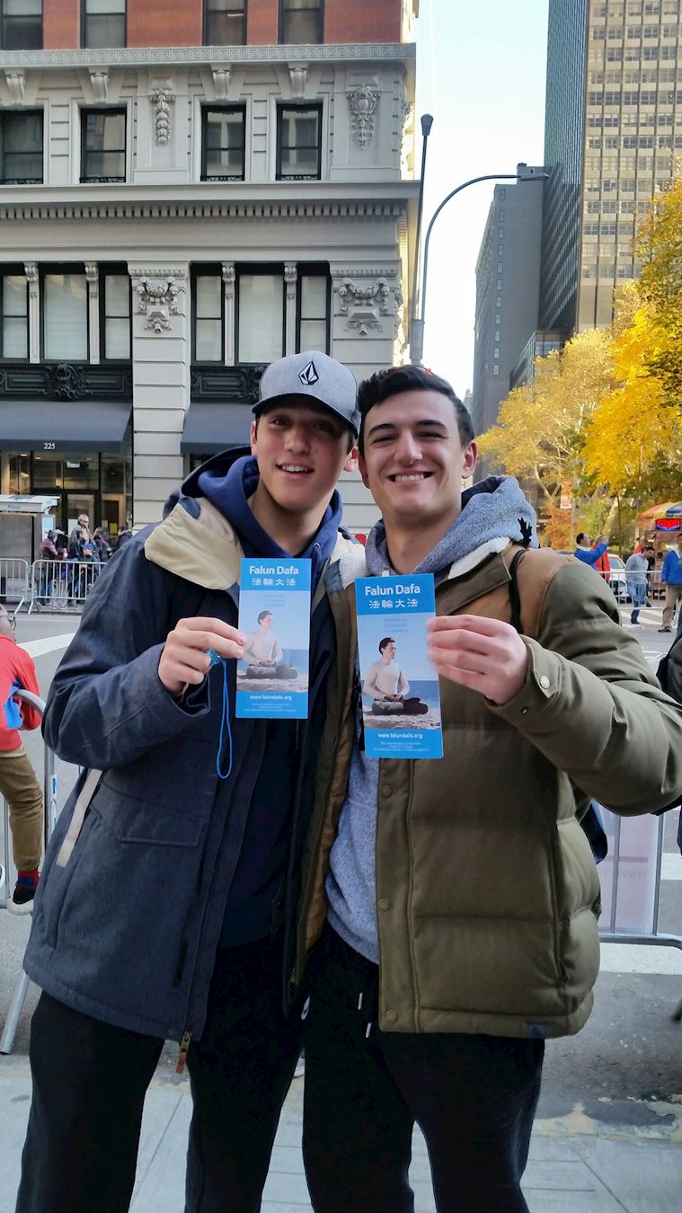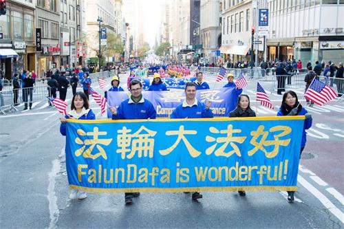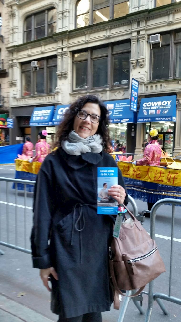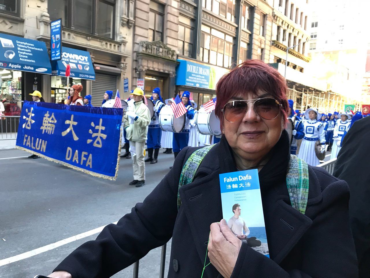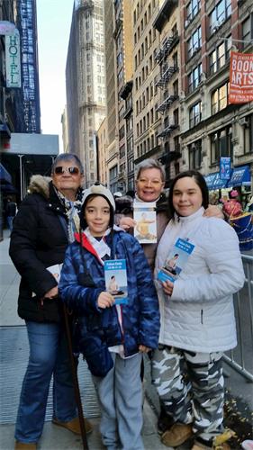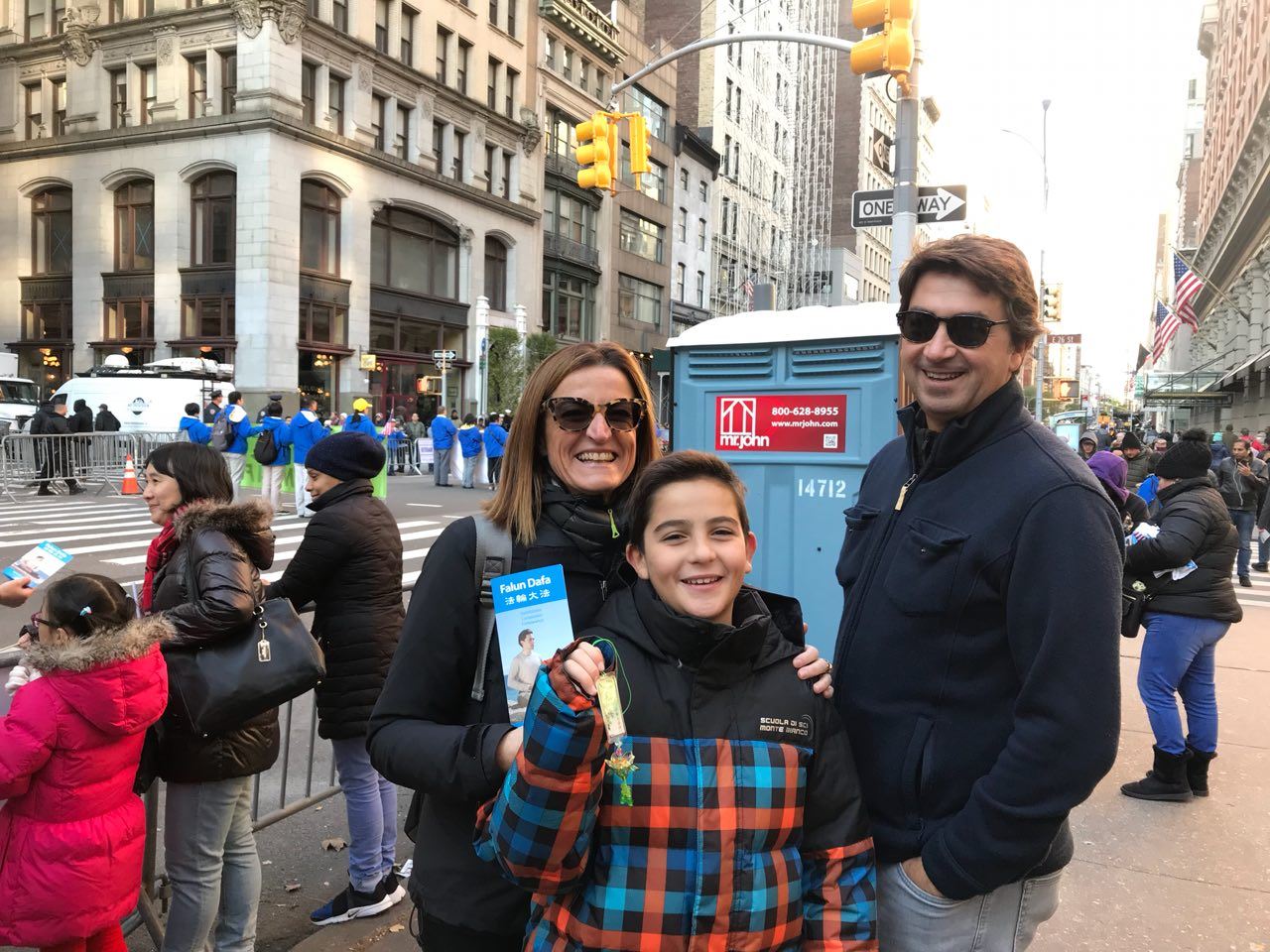有一家三口从意大利来曼哈顿旅游,爸爸说很荣幸地观看到了老兵节游行,他说:“法轮功的音乐(天国乐团)太棒了。”