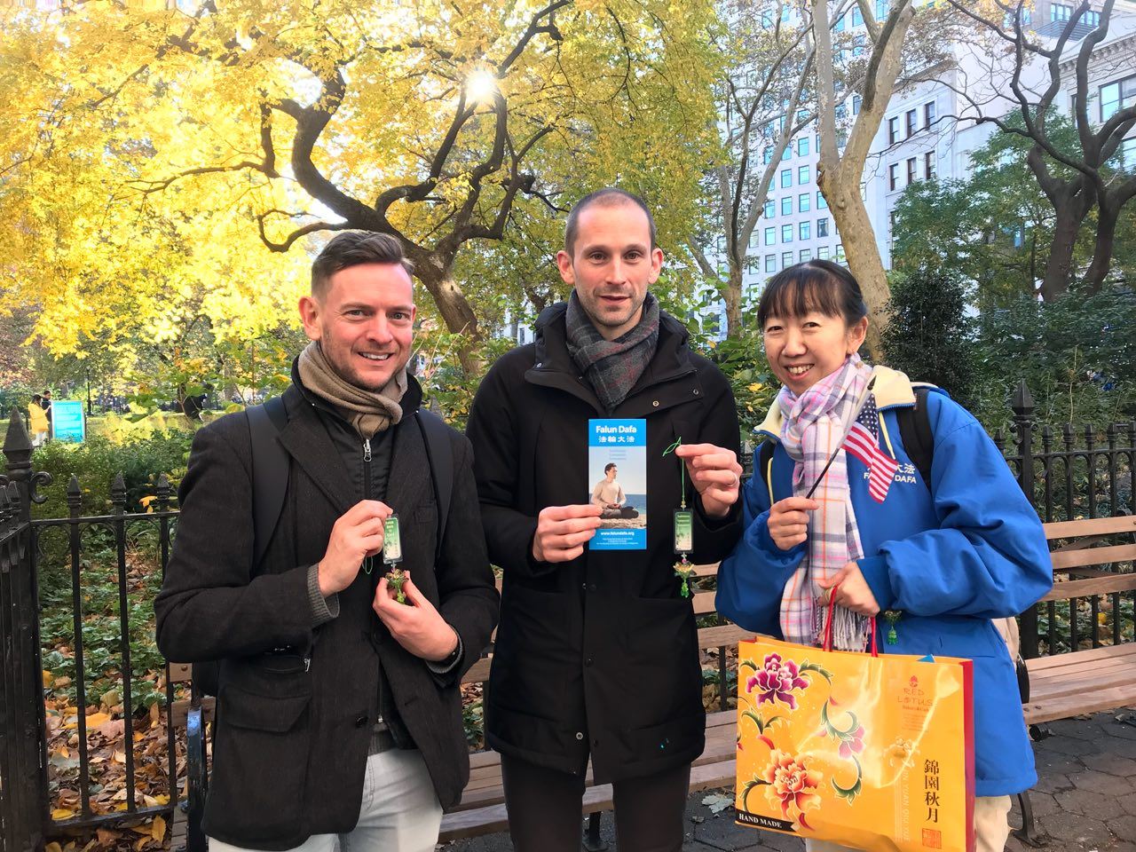 两位来自爱尔兰的男士接过传单和小莲花,表示知道法轮大法弘扬到了许多国家,他们回去会好好了解一下传单上的内容。