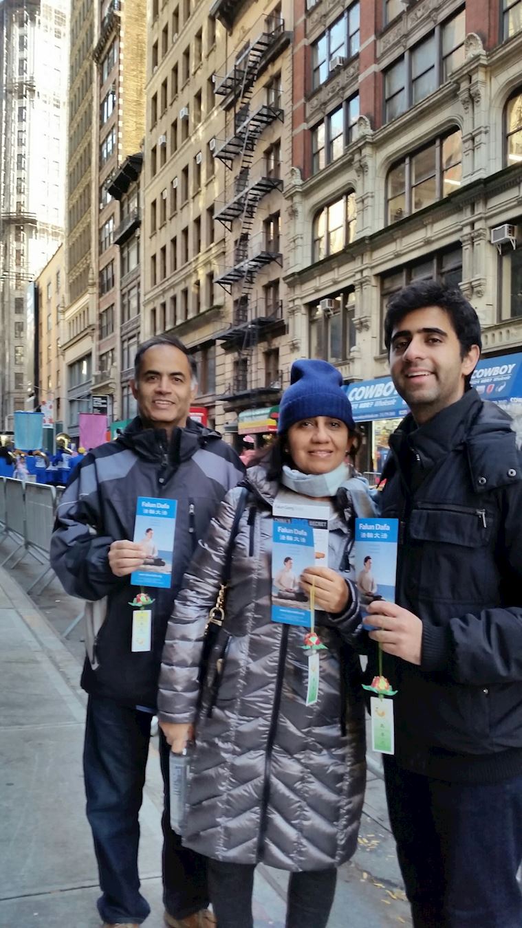 当法轮功学员把法轮功传单和小莲花送给路边执勤的三个警察时,他们愉快地接受并合影留念。高个子警察说:“这两年你们法轮大法日在曼哈顿的游行,我都执勤,希望下一次我还能站在这里。”“我知道在中国(中共)迫害你们,关押你们,来这里(美国)你们不要怕,由我们保护你。”他说。