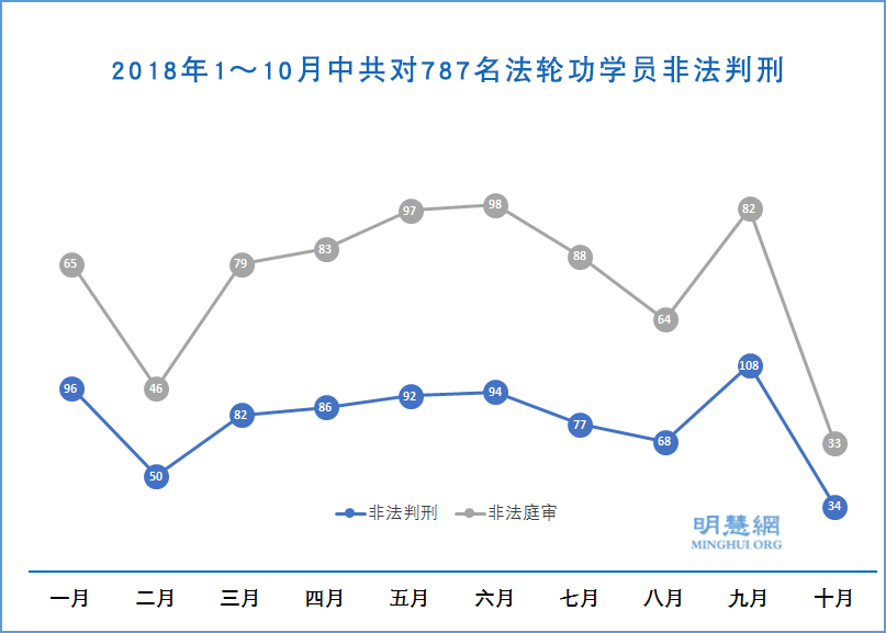![]() 图1:2018年1~10月中共对787名法轮功学员非法判刑 |