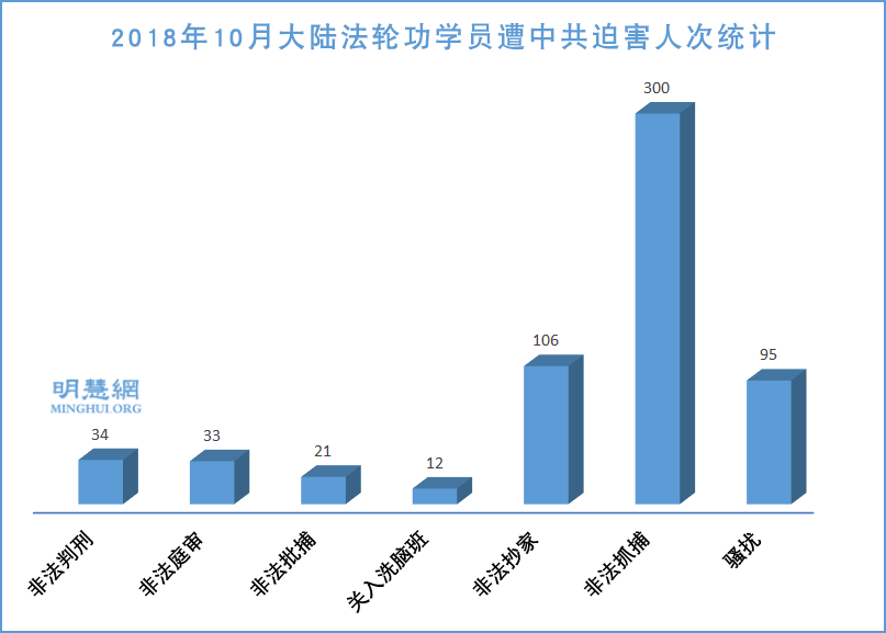 ![]() 图1:2018年10月大陆法轮功学员遭中共迫害人次统计 |