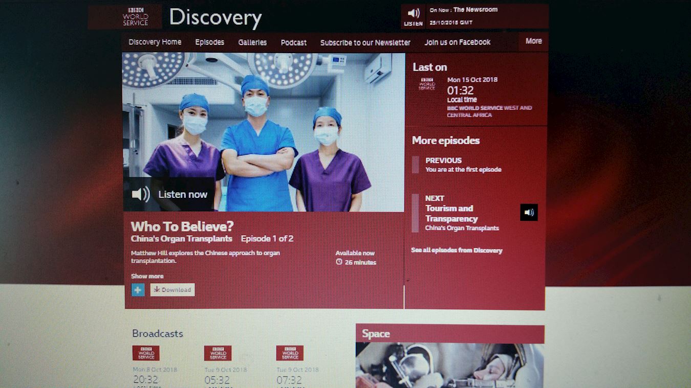 ![]() 图1:二零一八年十月十五日和二十二日,记者马修·希尔(Matthew Hill)的专门调查节目“发现:中国的器官移植产业(Discovery:China’s Organ Transplants)在BBC电台分两期播出,节目题目分别是”该相信谁(Who to Believe?)”和“(器官)旅游和透明度(Tourism and Transparency)”,两期节目在BBC电台共反复播放。 |