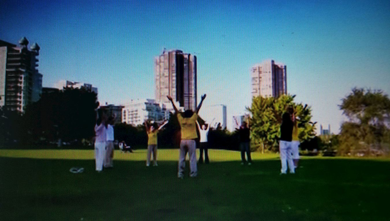 ![]() 图9:法轮功学员刘先生与其他法轮功学员集体炼功的画面 |