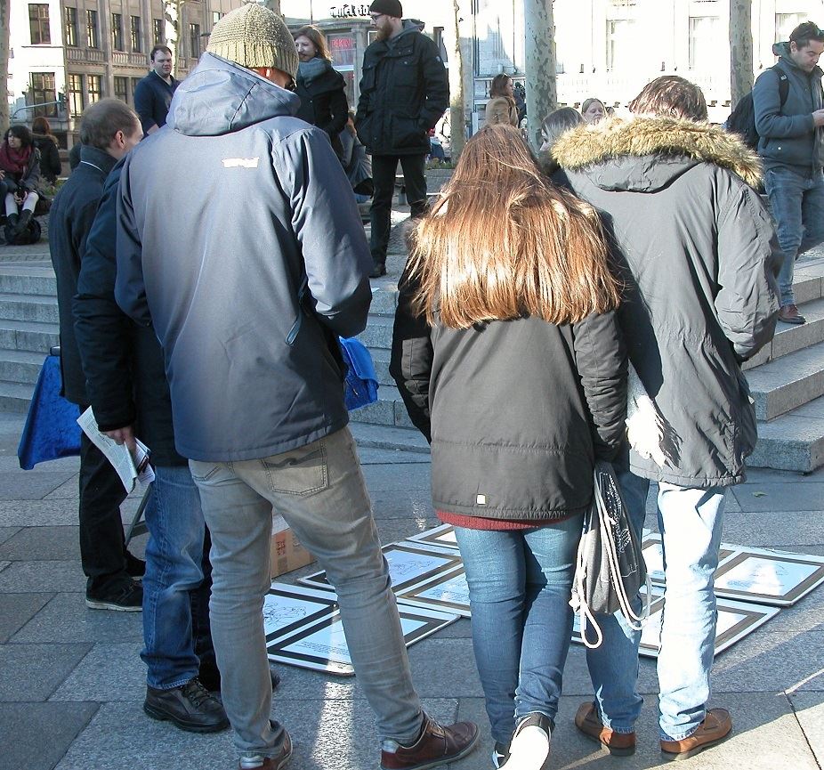 这里地处市中心,火车站边,步行街起点处,在这个晴朗的周六,除了众多的游客,很多科隆附近的居民也来到市中心购买圣诞礼物。许多路人被法轮功学员鲜明的横幅和展板吸引,他们了解到真相后,纷纷为反迫害签名。一些中国游客和留学生也在这里了解到中共对法轮功的迫害,并声明退出中共党、团、队组织。