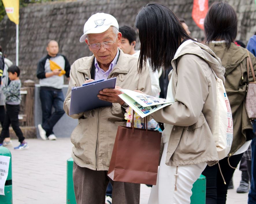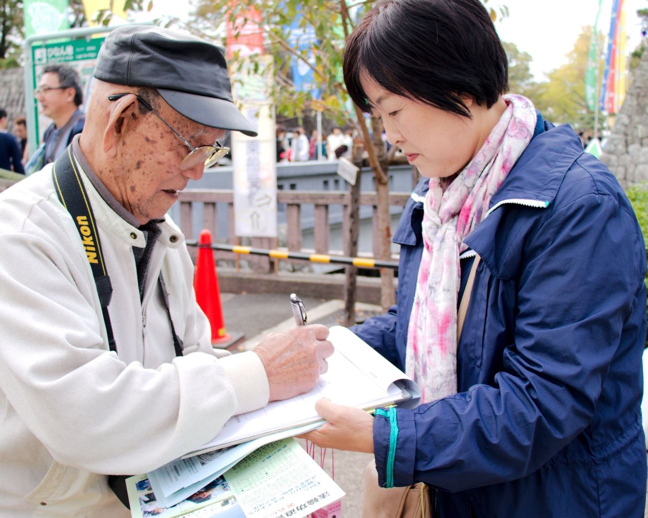 在主会场骏府公园的主入口处,数条用中、英、日文书写的“控告江泽民”、“停止迫害法轮功”、“停止活摘器官”等橫幅标语,吸引了大量的市民驻足观看。在大道艺主会场骏府公园的四个入口处,来自日本各地的法轮功学员,向来自世界各地的人们讲述了法轮功的真相,揭露中国大陆正在发生的对法轮功学员进行的残酷的迫害,以及中共令人发指的活摘包括法轮功学员在内的良心犯器官的恶行。当日本市民了解到在中国因修炼法轮功而遭到迫害和在中国正在发生的“活摘器官”的罪行时,十分震惊和愤怒。很多人看过横幅之后纷纷主动签名,有的人似乎已经等待了很久,迫不及待地在刑事举报书上签下自己的名字。