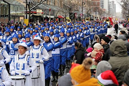 图1:以华人为主体的法轮大法天国乐团,连续多年受邀参加蒙特利尔圣诞游行,今年天国乐团队伍有一百五十人,跟往年一样是游行中声势最浩大的队伍。