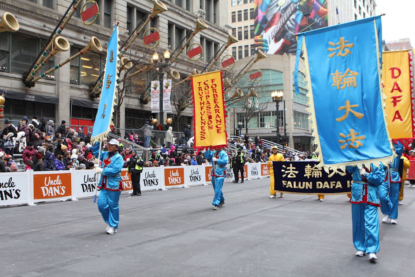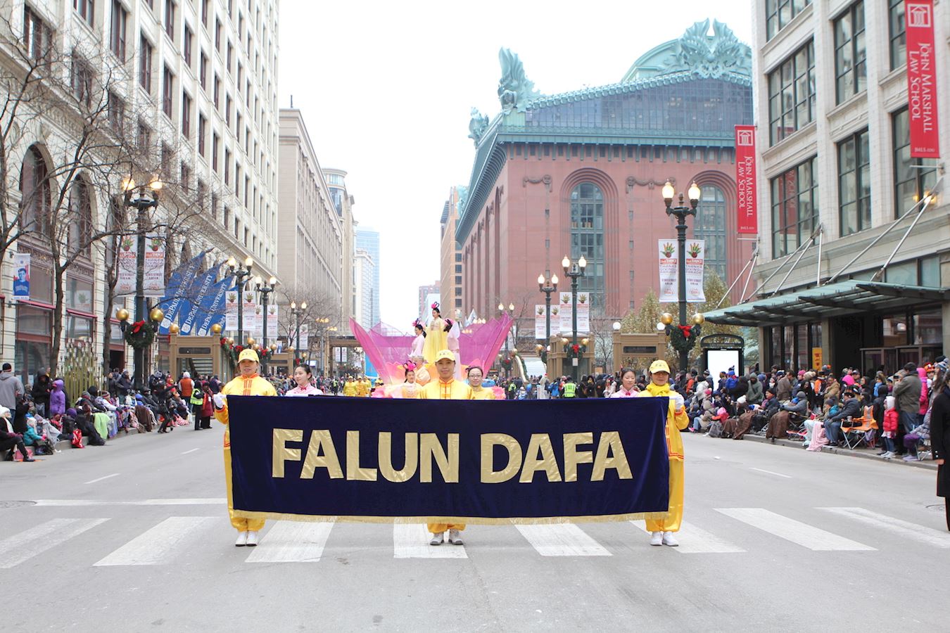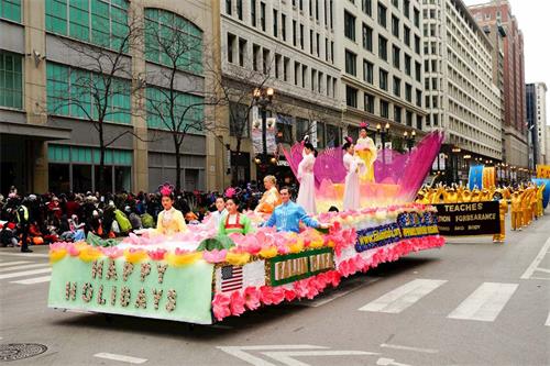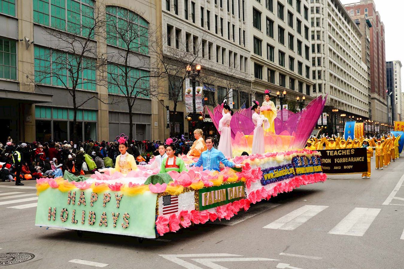 美中法轮大法学会是第一个应邀参加游行和表演的华人团体,今年是第十六次连续参加。多年来,法轮功花车备受组委会青睐,二零一六年曾将其印在游行的邀请函上。今年法轮功的队伍一亮相,观众们无不赞叹:“精彩(Amazing)!” “绚丽(Gorgeous)!”