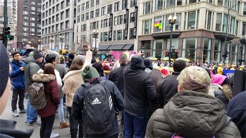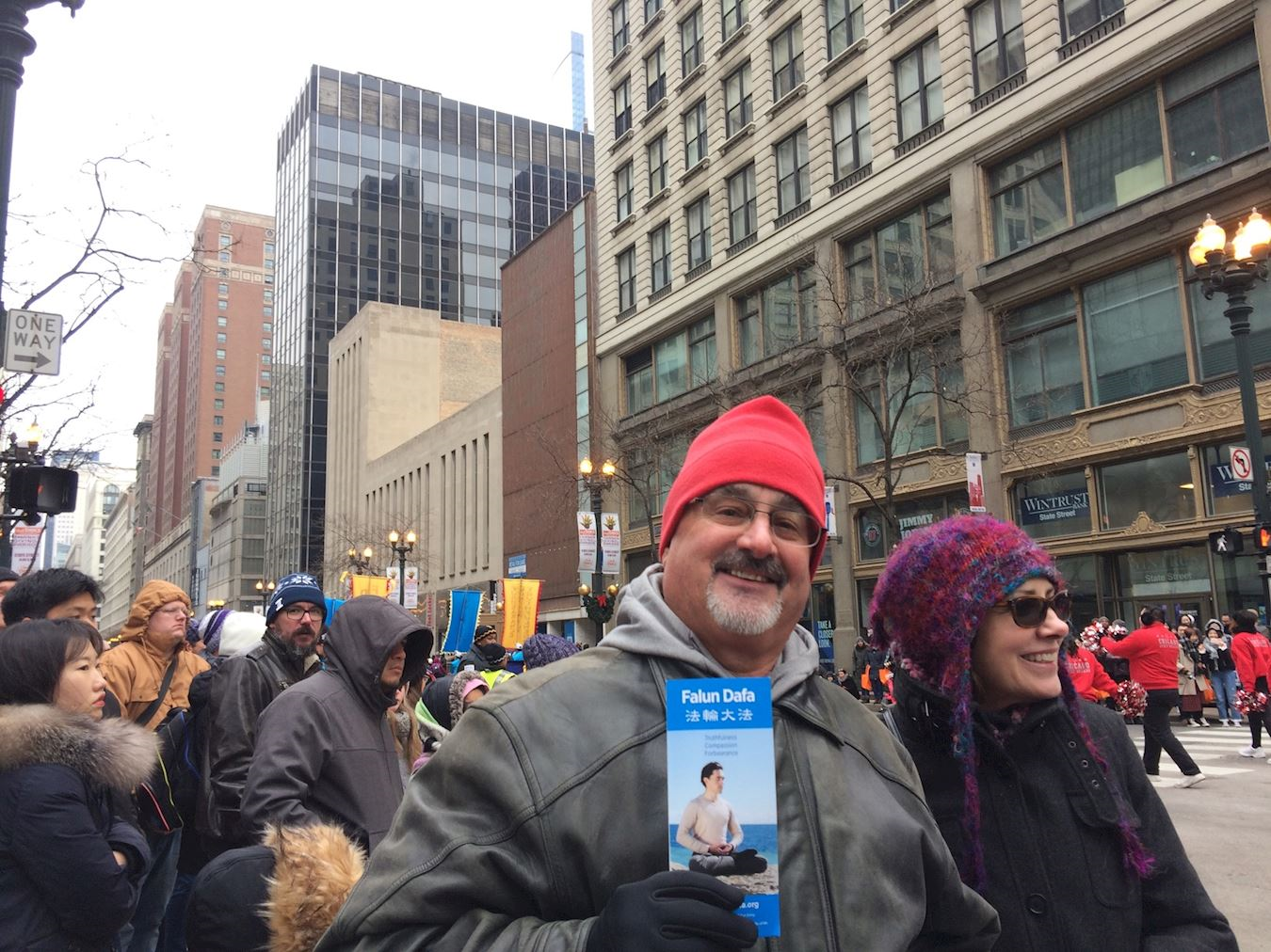 现场观众中,很多华人观众在拍摄法轮功队伍。在伊州大学香槟分校(UIUC)就读的冯同学带母亲到芝加哥旅游。冯同学在游行中看到法轮功的队伍,他说,“在游行中第一次见到法轮功,感觉他(法轮功)属于锻练身体、健身那种。我觉得挺好的。”