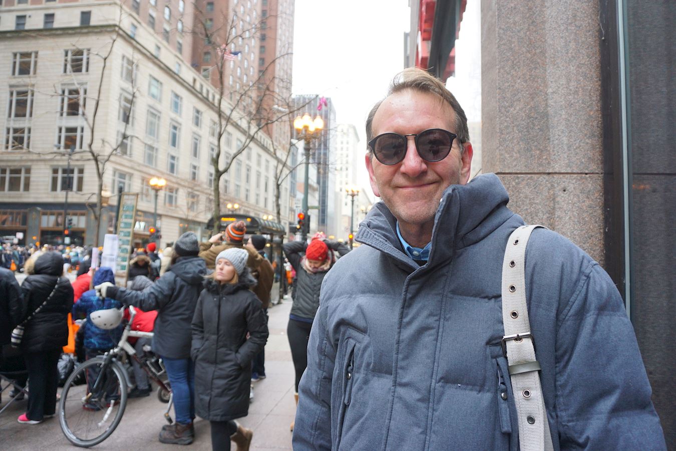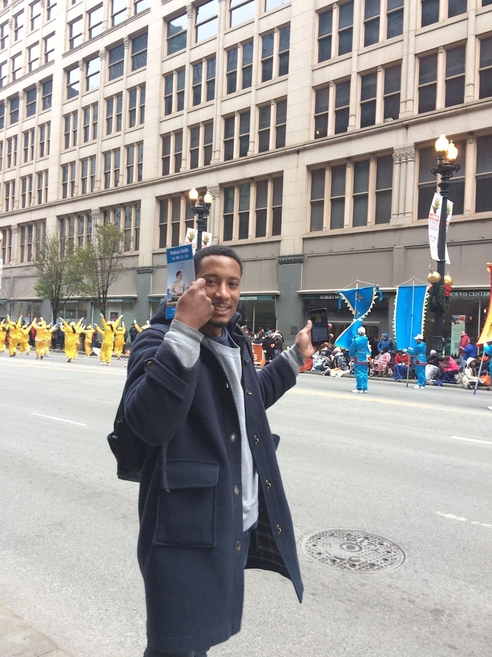 “精彩(Amazing),精彩(Amazing),精彩(Amazing)!”布兰登·卡特(Brandon Carter)一连用三个赞叹。他用录像记录了法轮功学员的队伍。他说:“太棒了,花车如此华丽,(花车上的大法弟子)美丽动人,非常高兴看到法轮功团体参加芝加哥感恩节游行。”