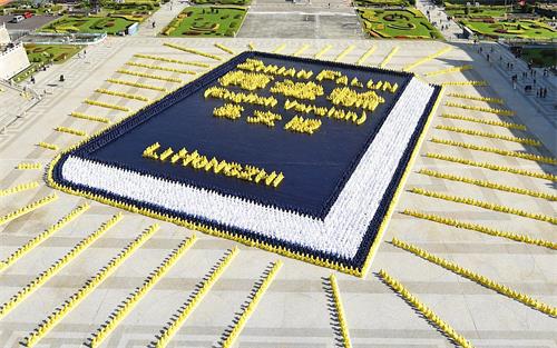 今年的排字主题是英译本《转法轮》:深蓝色的书皮、金黄色的书名与作者名、白色的书页,并绽放四十二道金黄色的光芒,场面相当壮观殊胜,吸引各国游客驻足观看、拍照留念。“哇!你看炼法轮功的人这么多耶!那边全都是耶!”一名女士拉着身边的友人惊呼,对如此盛大的场面感到震撼。