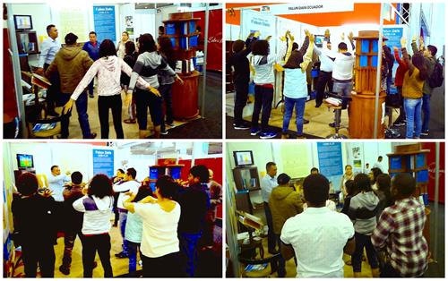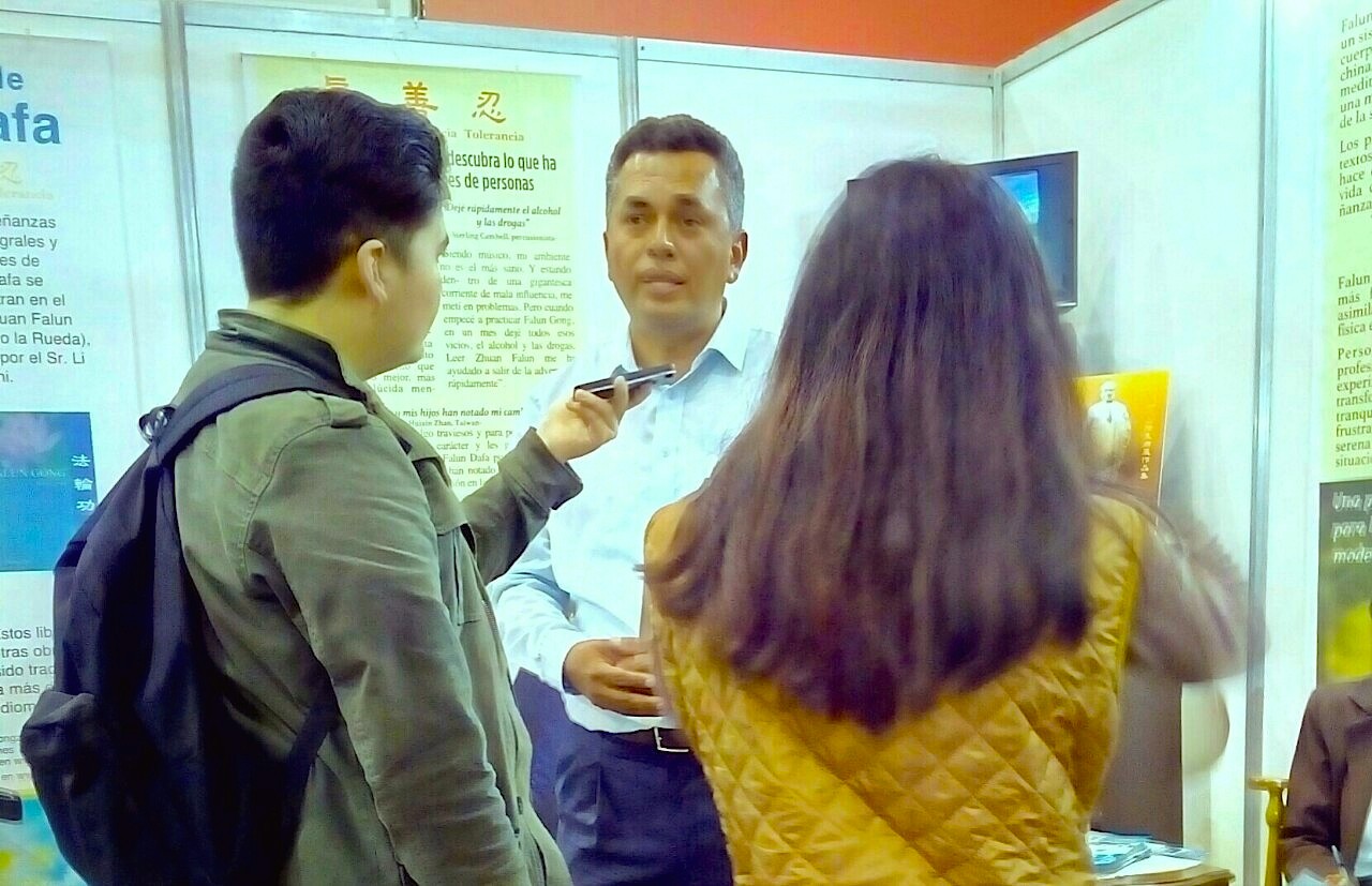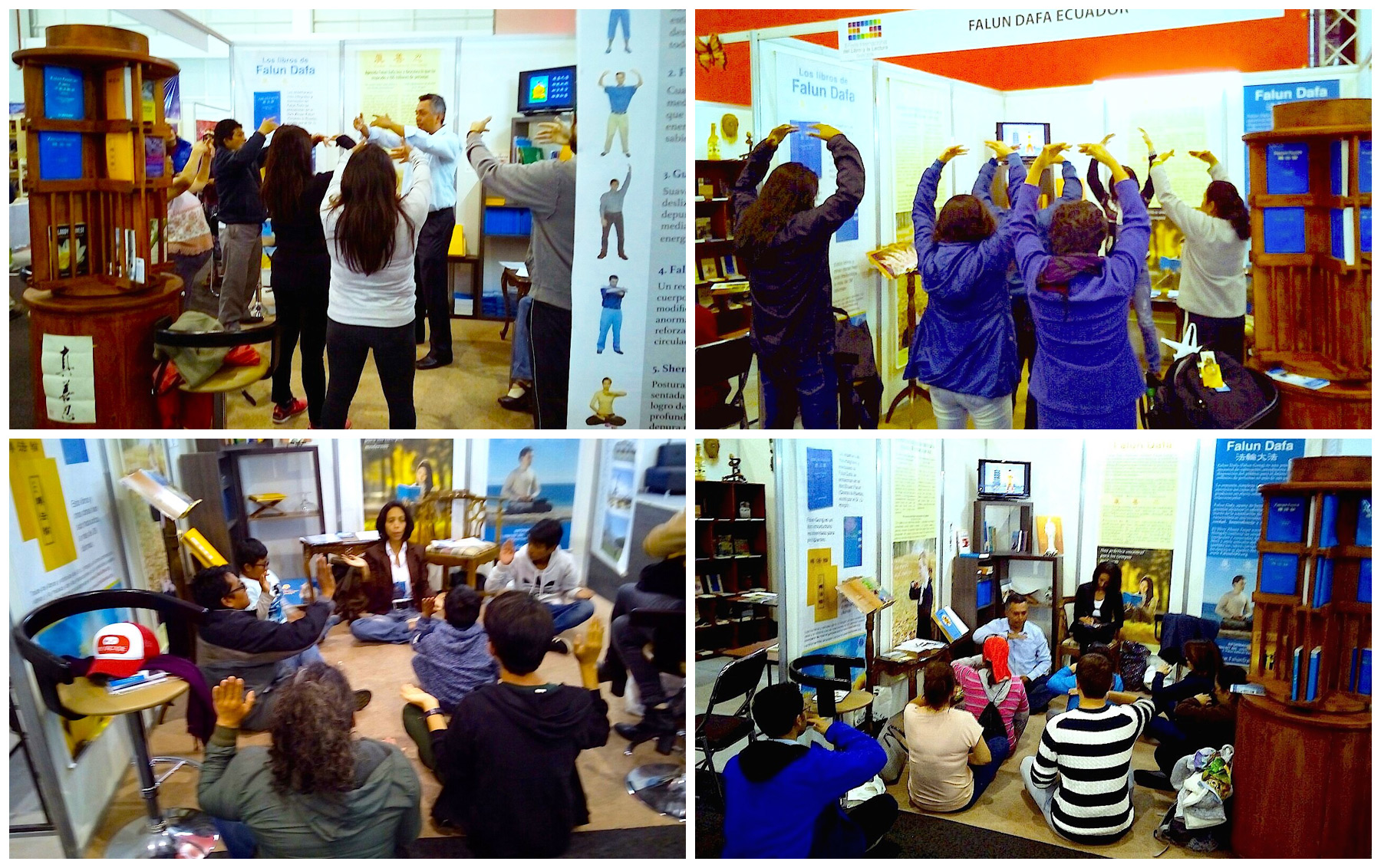 在书展期间,厄瓜多尔法轮功学员还接受了厄瓜多尔国际大学新闻系的采访,这两位记者也参加了炼功,感觉到了法轮功功法的美好。