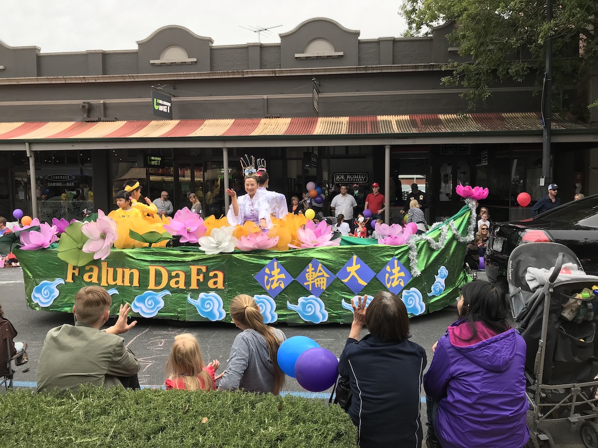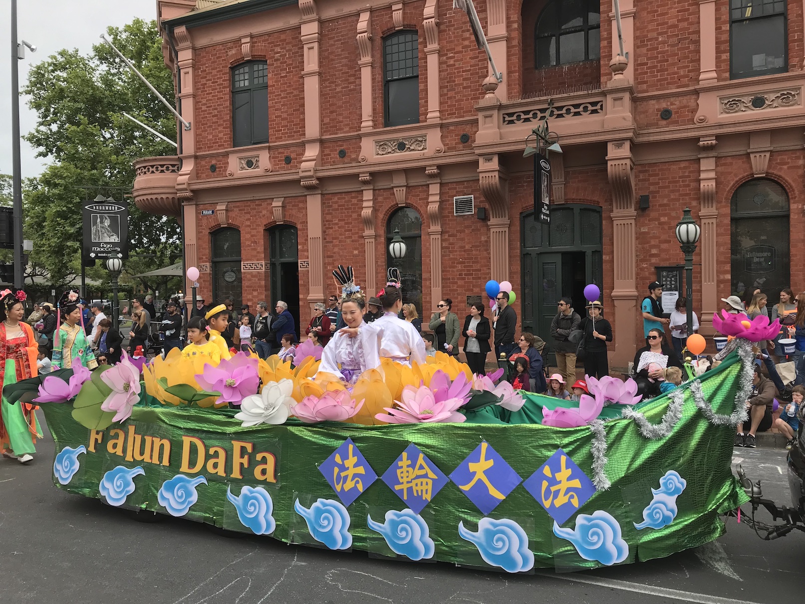 游行开始前就有不少人被法轮功的花船和身着古典服饰的学员们吸引,纷纷拍照。几位华人青年经过,一直注视花船装饰和大字,学员主动介绍,他们都很友善地微笑,其中一人点点头跟着学员说:“法轮大法好!”