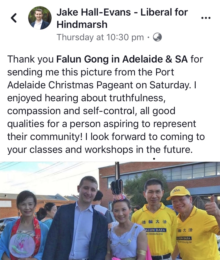之后他在脸书上分享了照片,并写道:“感谢南澳阿德莱德法轮功学员给我寄来照片,我很高兴听闻真、善、忍、自我控制,这些对于有志于代表社区的人来说,都是很好的品格!我期待着将来参加你们的炼功和活动。”