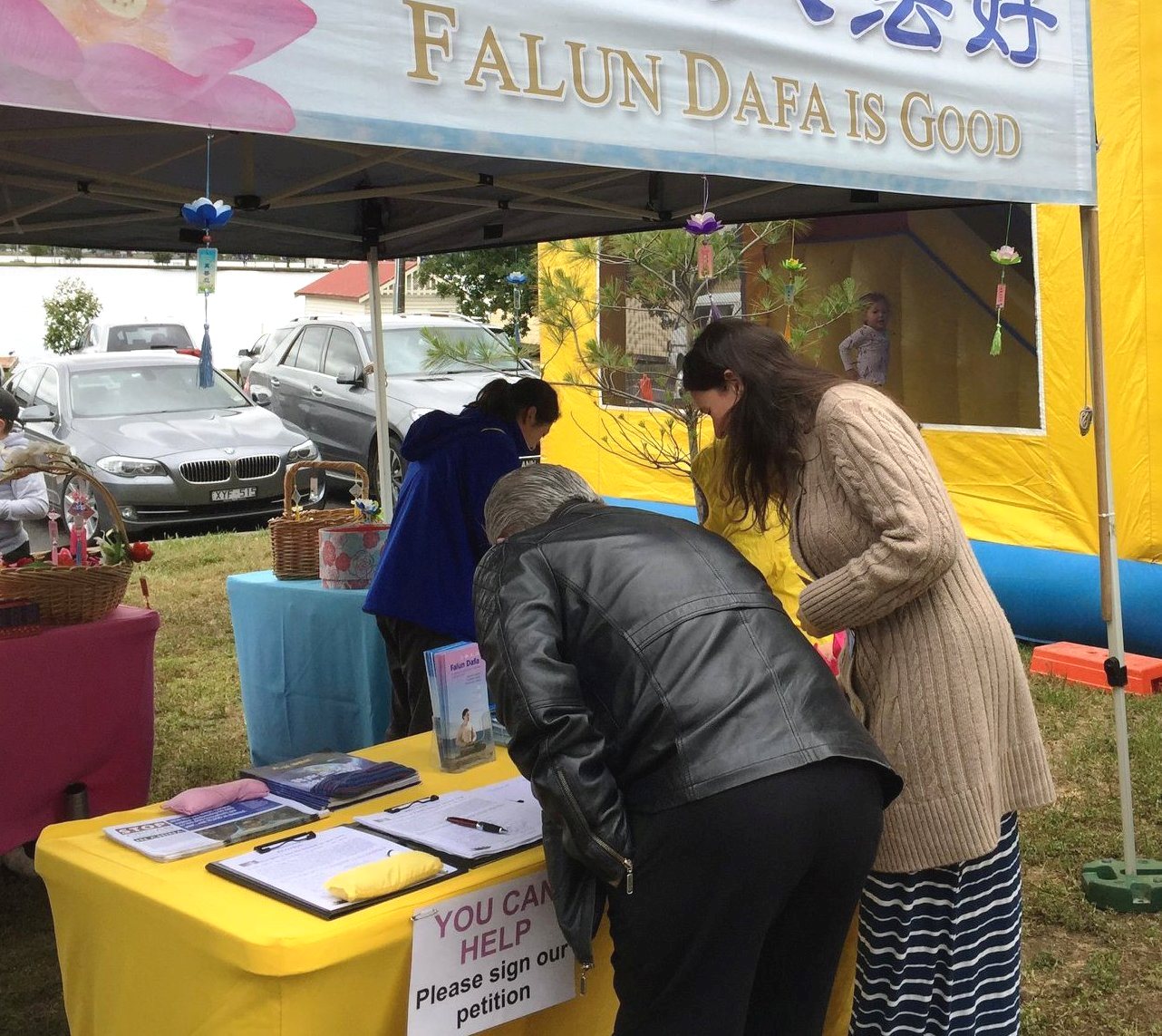 ![]() 图1:巴拉瑞特举办的慈善市集上,法轮功展位吸引民众驻足。 |
