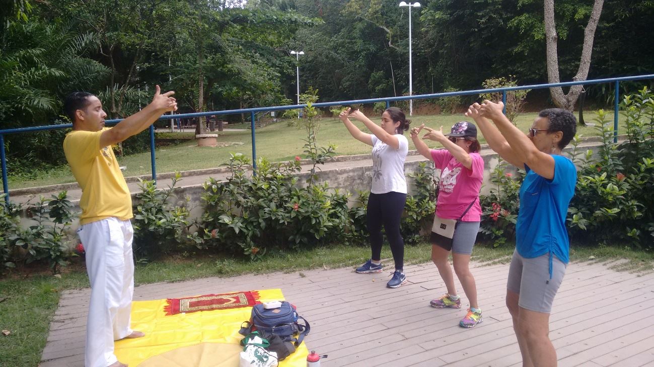 在巴西的假日这一天。学员们来到城市公园炼功点弘法,经过的市民大都拿了真相传单,有的人当时就加入学炼的。
