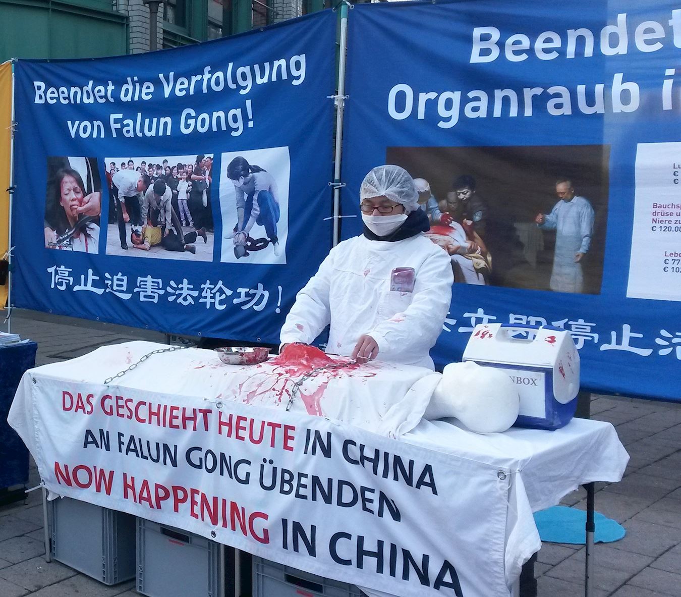 同时法轮功学员通过现场模拟揭露中共活摘法轮功学员器官的罪行。“哇,这太残忍了!”一位女士看着模拟场景惊呼。很多路人也因此而感到震惊,当得知中共政权动用军、警、司法及医疗系统有组织的大面积活摘法轮功学员器官的罪行后,很多人立即签名要求制止中共活摘罪行。