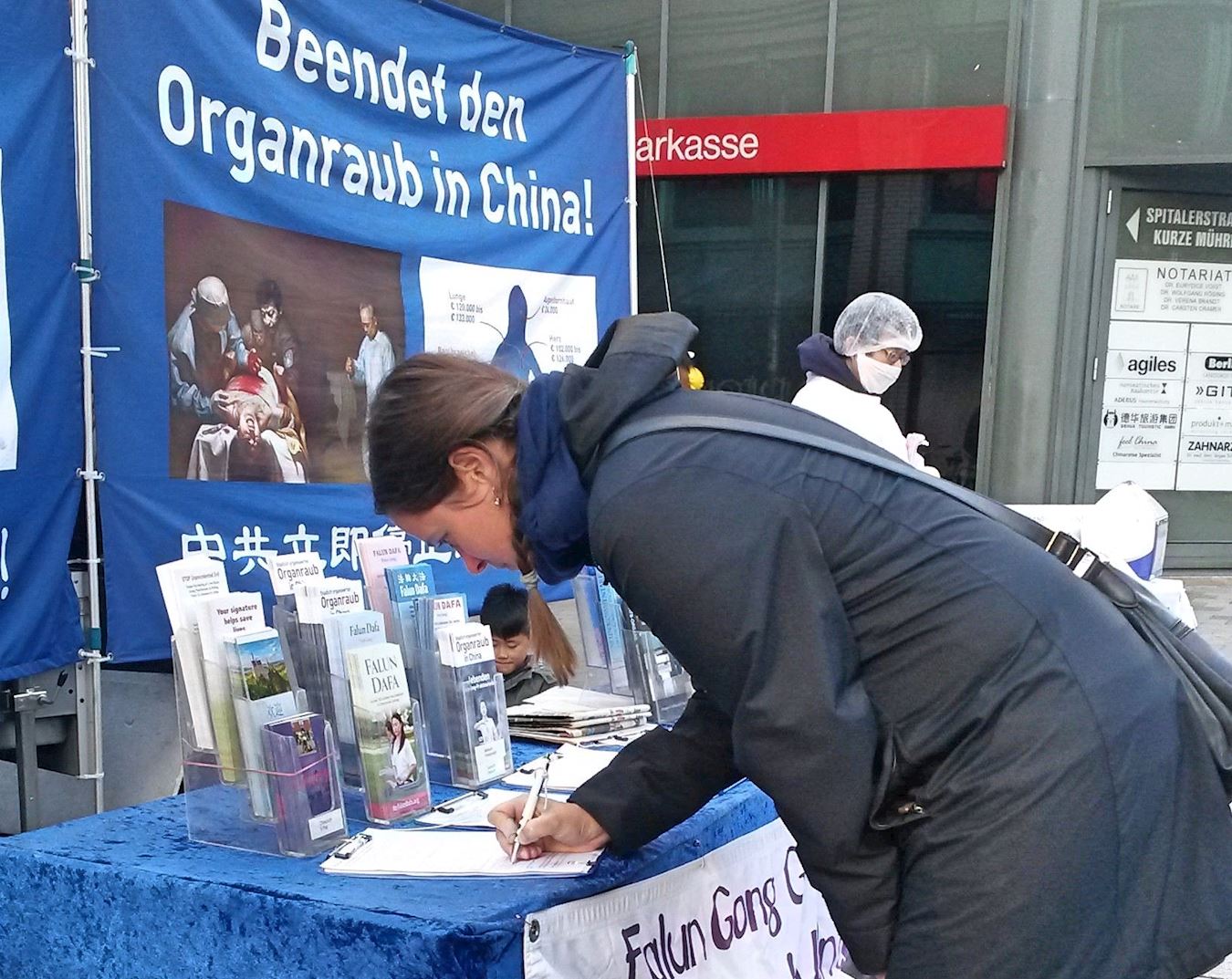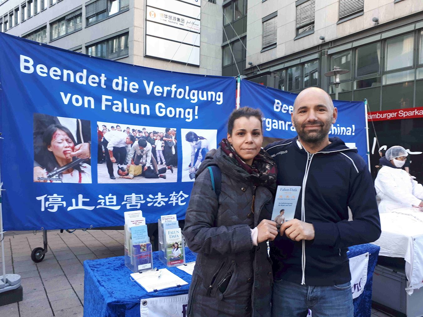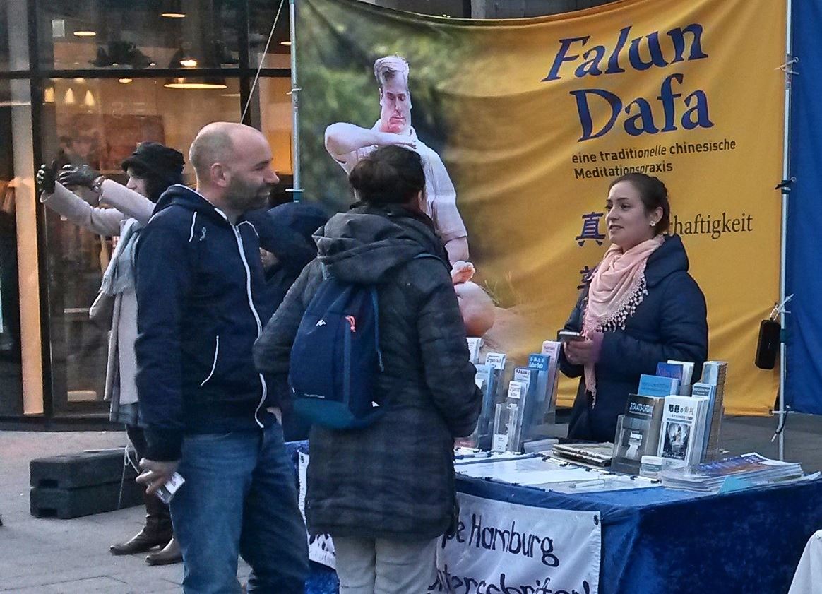 现在居住在汉堡的拉法埃达(Raffaeida)来自也门,她先生梅苏特(Mesut)来自伊拉克。在听到扬声器中播放的关于法轮功的真相后,他们驻足与法轮功学员交谈。他们谈到自己第一次听说对法轮功的迫害,特别是中共活摘的罪行。拉法埃达说:“这样的(罪行)不该发生。摘取器官,谋取利益并杀戮——这不该被容许发生!”她先生梅苏特也是同样的想法,他们签名支持法轮功学员。