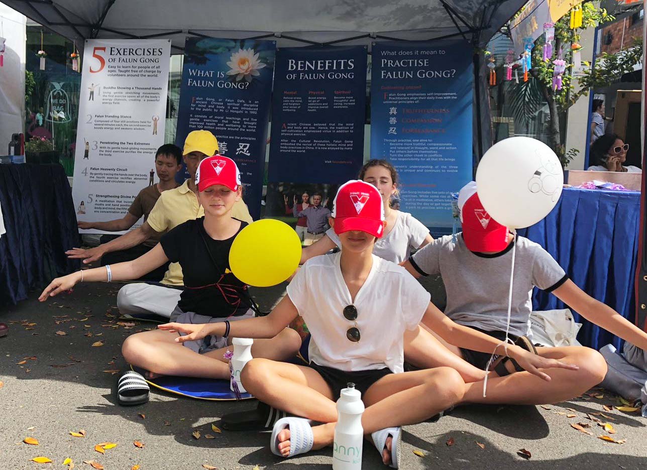 无论外界如何人声鼎沸,法轮功学员神情祥和,平静地演示着五套功法,他们身上展现出的那种超凡脱俗的境界和慈悲祥和的能量,使过往游人纷纷驻足,认真观看法轮功学员炼功、打坐。当人们了解到如此美好的功法在中国遭受残酷迫害时,无不对中共暴行感到愤慨。