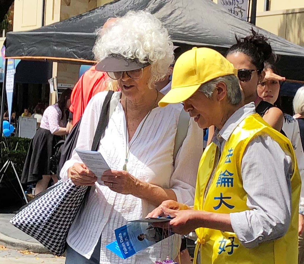 法轮功学员海伦·陈(Hellen Chen)表示:今天很多人想来学习炼功,特别是当他们听到法轮大法是一种古老的性命双修功法,要重德,要修心性才能修炼出好的身体时,他们都特别感兴趣,并希望知道最近的炼功地点。我告诉他们,最好每天读《转法轮》书(在网上能免费下载),学习这本书会帮助我们成为更好的人,当我们道德提升时,人的身心才会变的越来越健康、快乐。他们非常认同,感觉非常好,都留了联络方式,希望修炼法轮功。