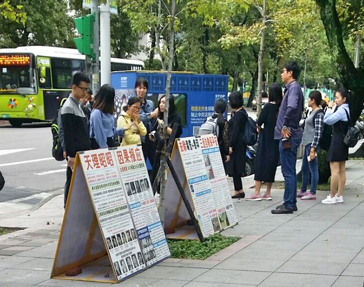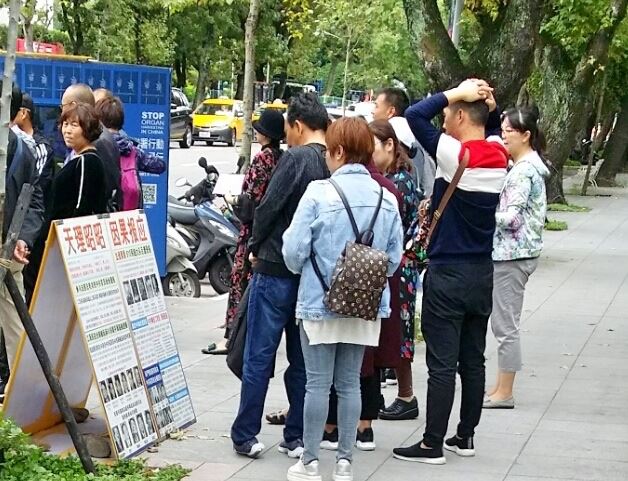有位移居上海二十多年的老先生回台湾探亲,经过真相点时看到年龄很小的法轮功学员正在打坐,停下来拍照想作为作画的题材。他向学员表示:“当时(迫害前)在上海真是好多人在打坐、在炼功啊,我都记得……”但老先生不明白法轮功为什么要去北京上访,他说:“上访就等于把命交出去!”学员指向“四二五和平上访”的展板跟这位老先生说明原委。老先生表示,在大陆生活久了,对法轮功的印象都来自中共喉舌媒体宣传下的谎言,这次让他了解了法轮功的真相,破除了对法轮功的误解。