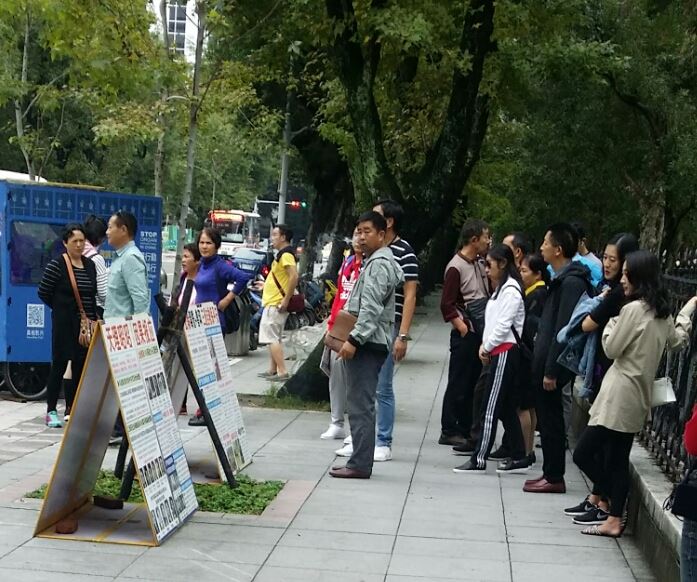 有位来自江苏的老先生走到了揭露“天安门自焚案”是骗局的展板前,一看:“这法轮功的啊?!”学员表示回应:是。老先生神色紧张的小声说:“不允许,政府不允许!”接着赶紧唤来了三位同团的一起看展板,学员在旁跟他们说明自焚伪案中的种种破绽,老先生们一边听、一边专注观看,包括“四二五上万名法轮功学员和平上访”的展板上的图文说明。临走前,学员帮三位老先生做了三:退.(退出中共邪*党-及其团队组织)。