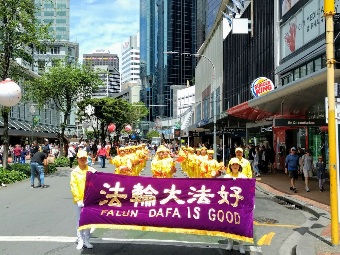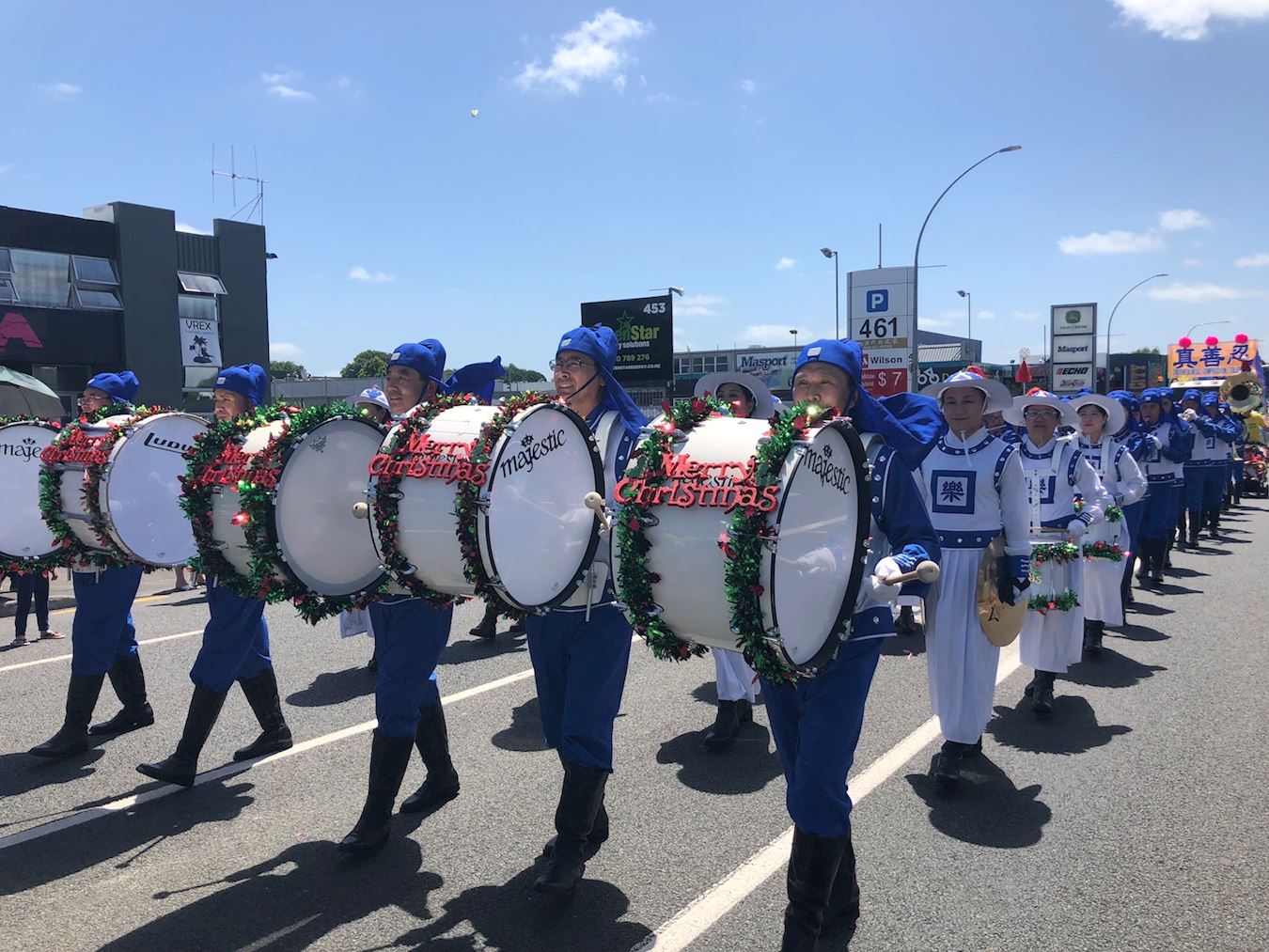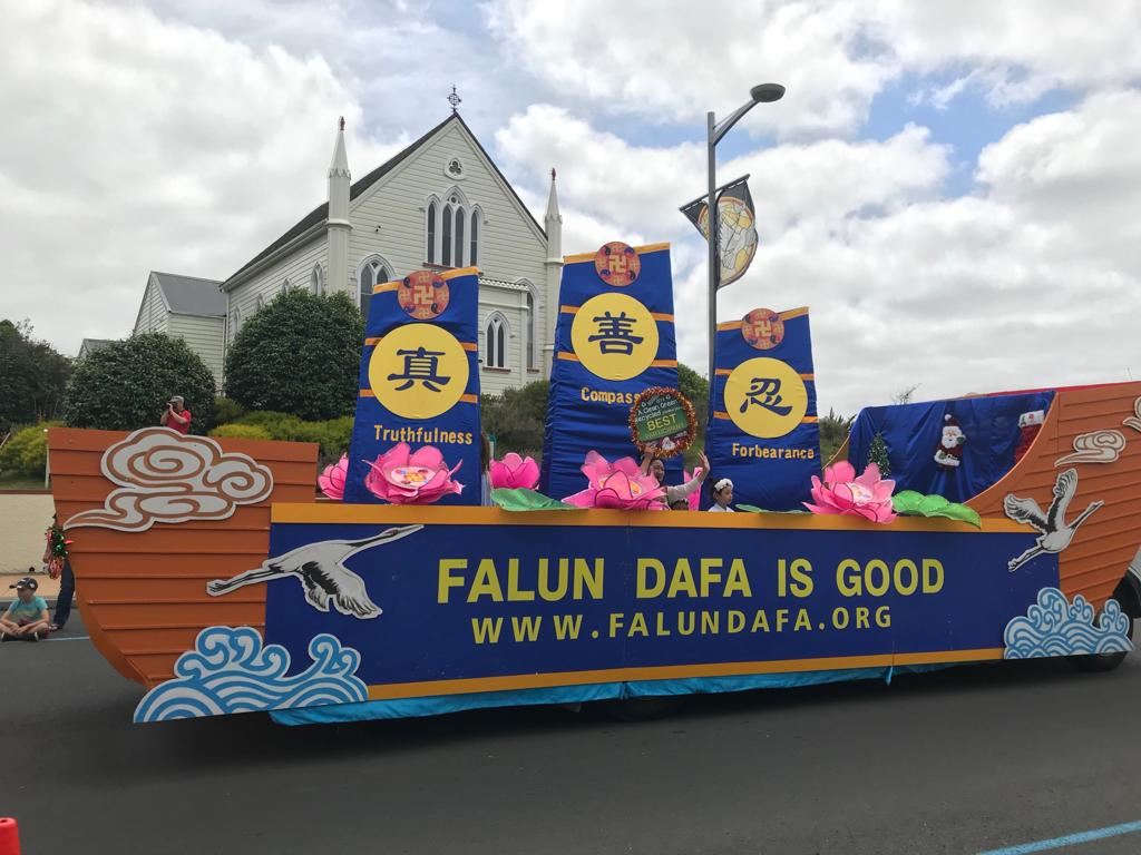 今年的最后一场游行十二月九日在哈密尔顿市举行,这是新西兰第四大城市,风景优美,民风朴实。当法轮功学员组成的天国乐团,踩着整齐的步伐出现在游行中时,亮丽的服饰,优美的乐曲赢得了阵阵掌声,美丽的花车带着“真善忍”和“法轮大法好”的信息,中间旋转的中英文《转法轮》书本模型很是引人注目。