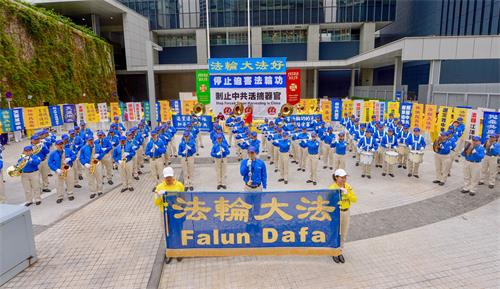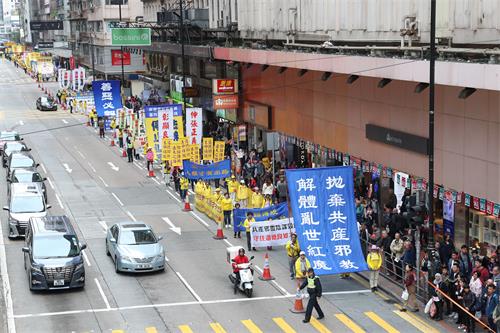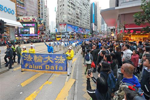 下午两点,集会中午结束后,近千人的游行队伍在法轮大法天国乐团雄伟的演奏声引领下,由北角英皇道游乐场起步,途经铜锣湾、湾仔、中环等港岛区购物热点,队伍约下午六点后抵达终点中联办,沿途引来大批港人和大陆游客夹道观看。