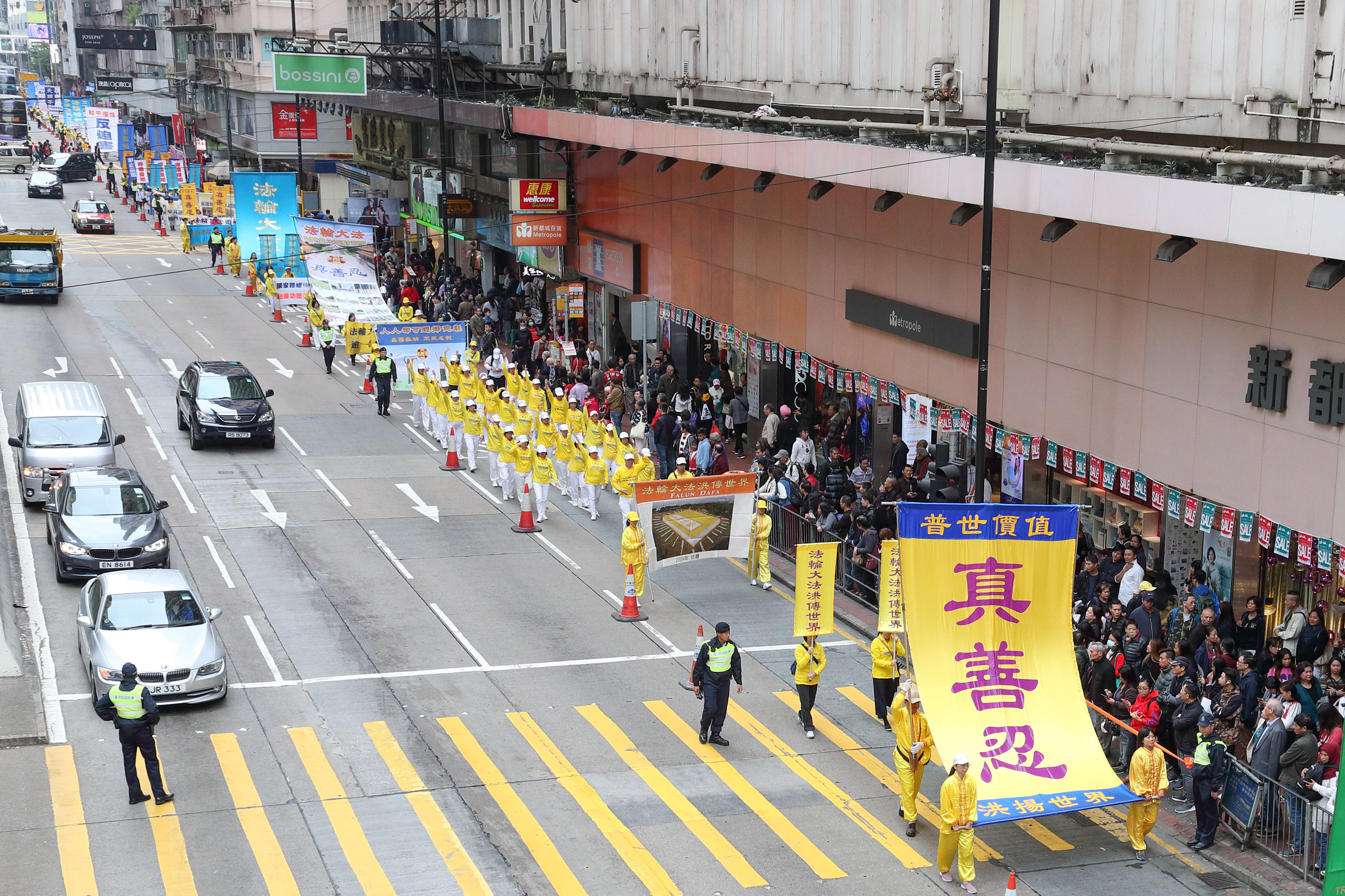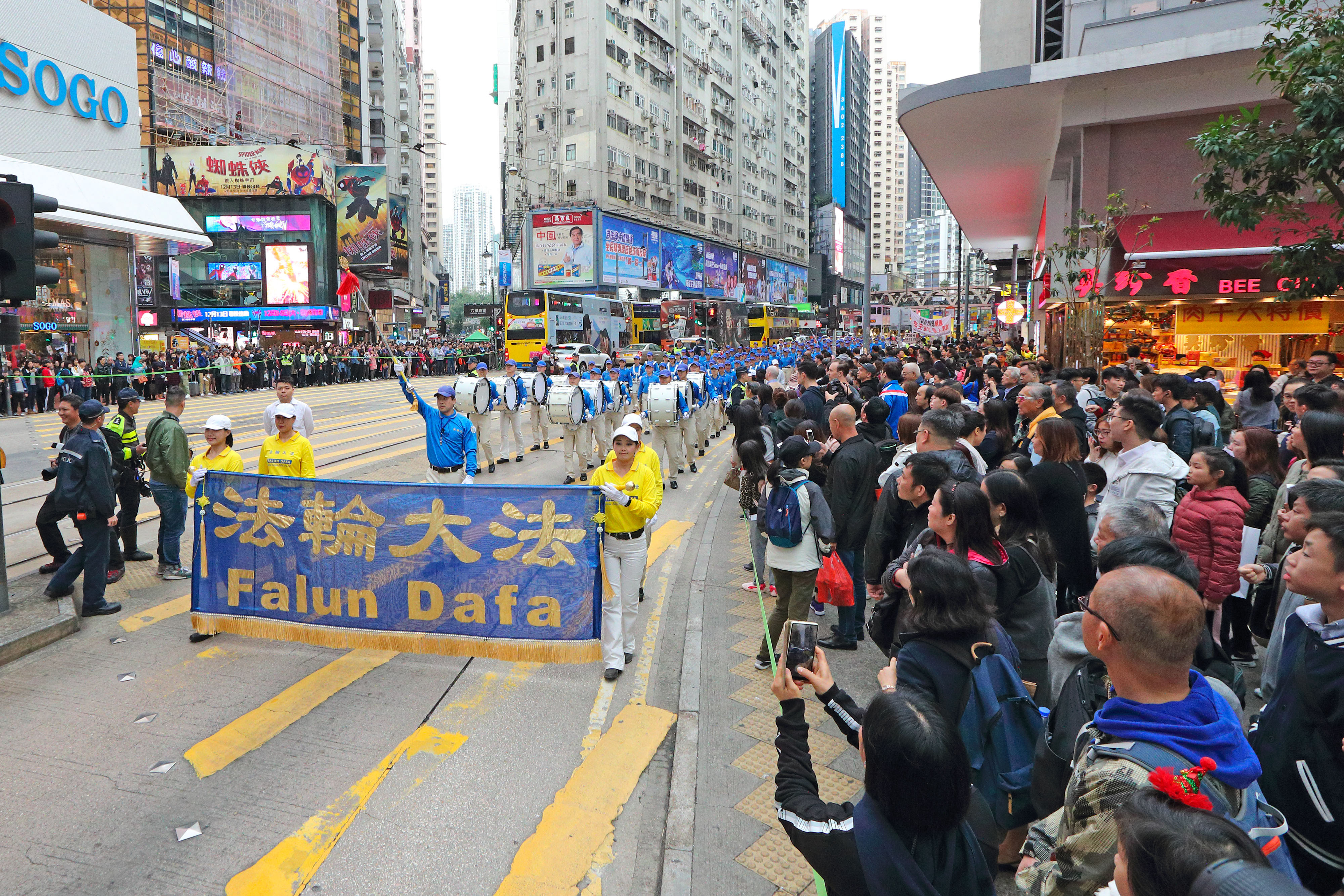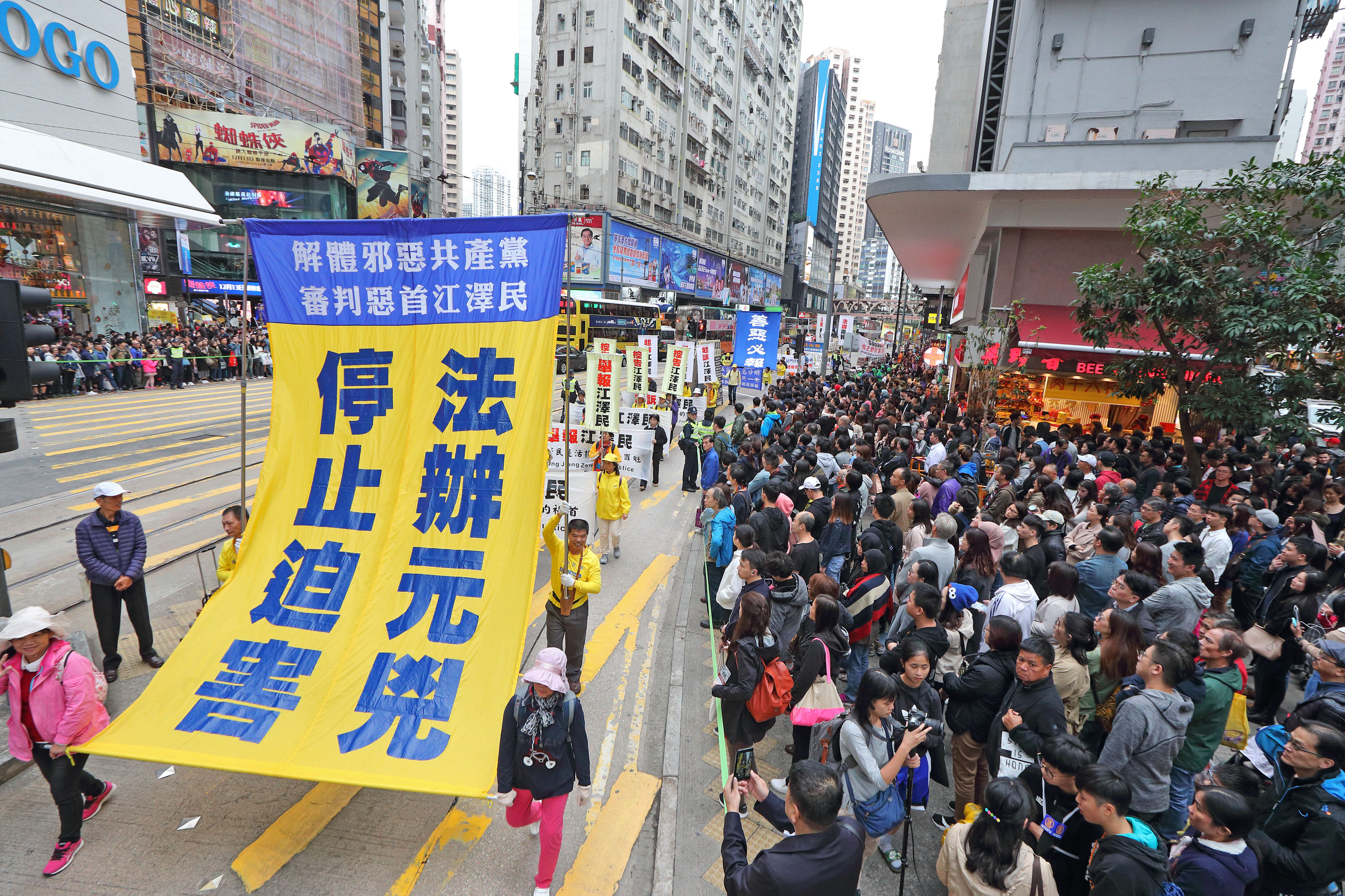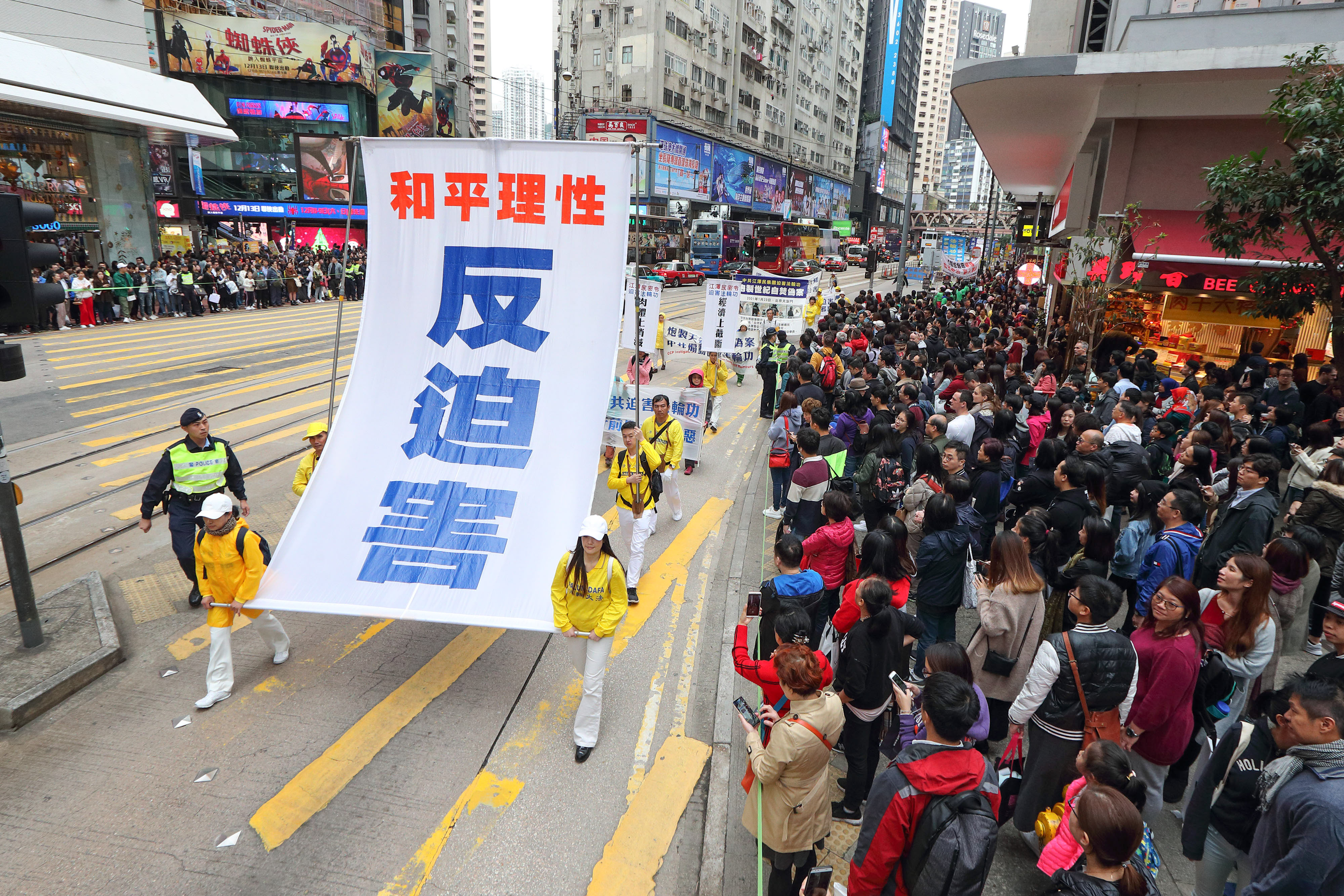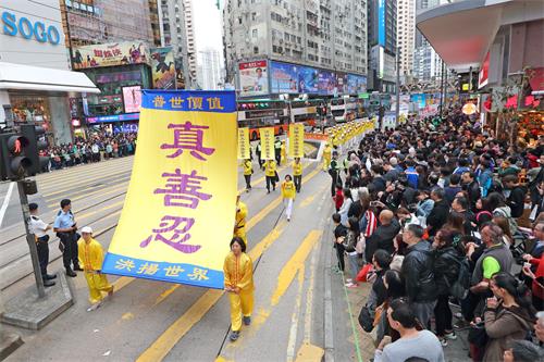 游行队伍分为“法轮大法洪传世界”、“和平理性反迫害”、“天灭中共 三:退.是福”、“惩凶除恶 复兴善良”、“了解真相 迈向光明”等几大方阵。“普世价值真善忍”、“停止迫害 法办元凶”等巨型横幅以及大小幡旗横幅,沿途吸引许多大陆游客及本地市民观看,不少人拿手机拍下游行的盛大场面。