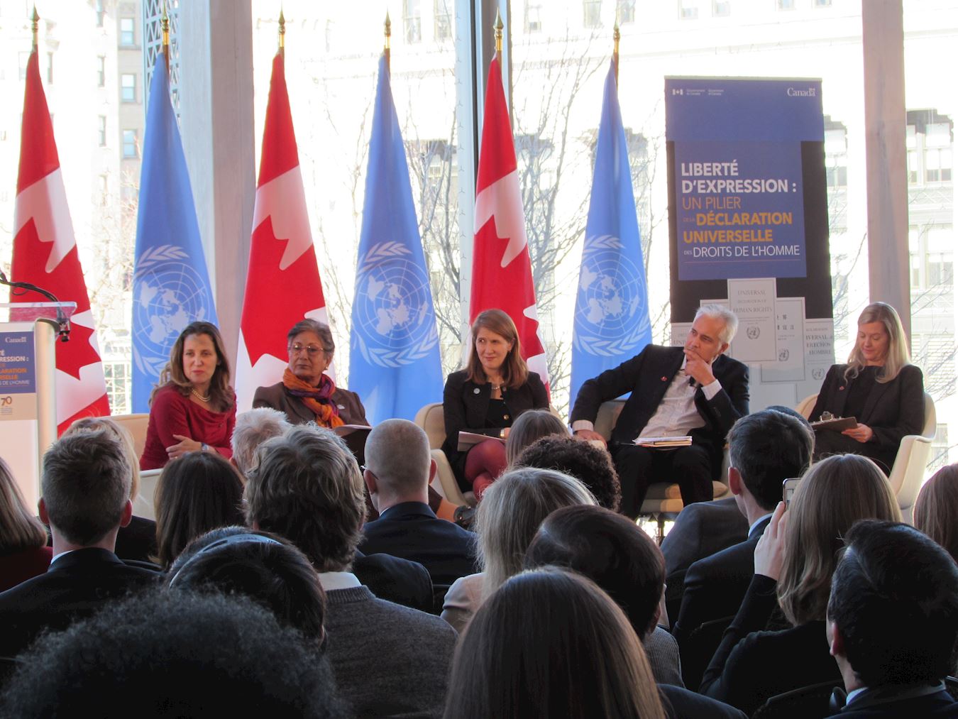 ![]() 图:12月12日,加拿大“人权、自由和包容”办公室主办的关于言论自由和保护记者的小组讨论。由外交部长方慧兰(Chrystia Freeland, 左一)主持。 |