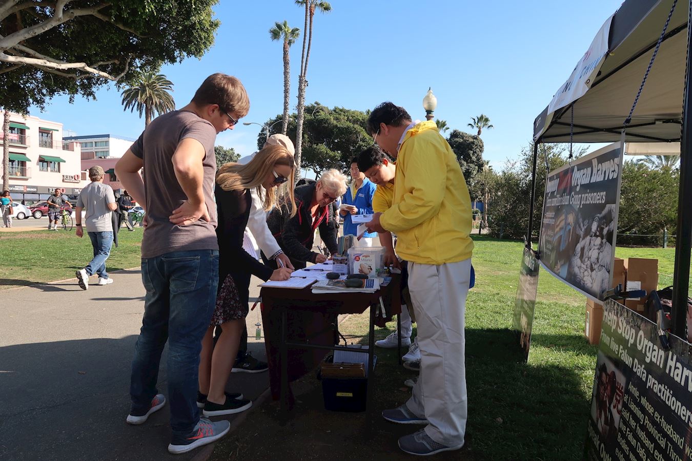 ![]() 图8:圣莫妮卡海滩公园的游客签署停止活摘器官的请愿书。 |