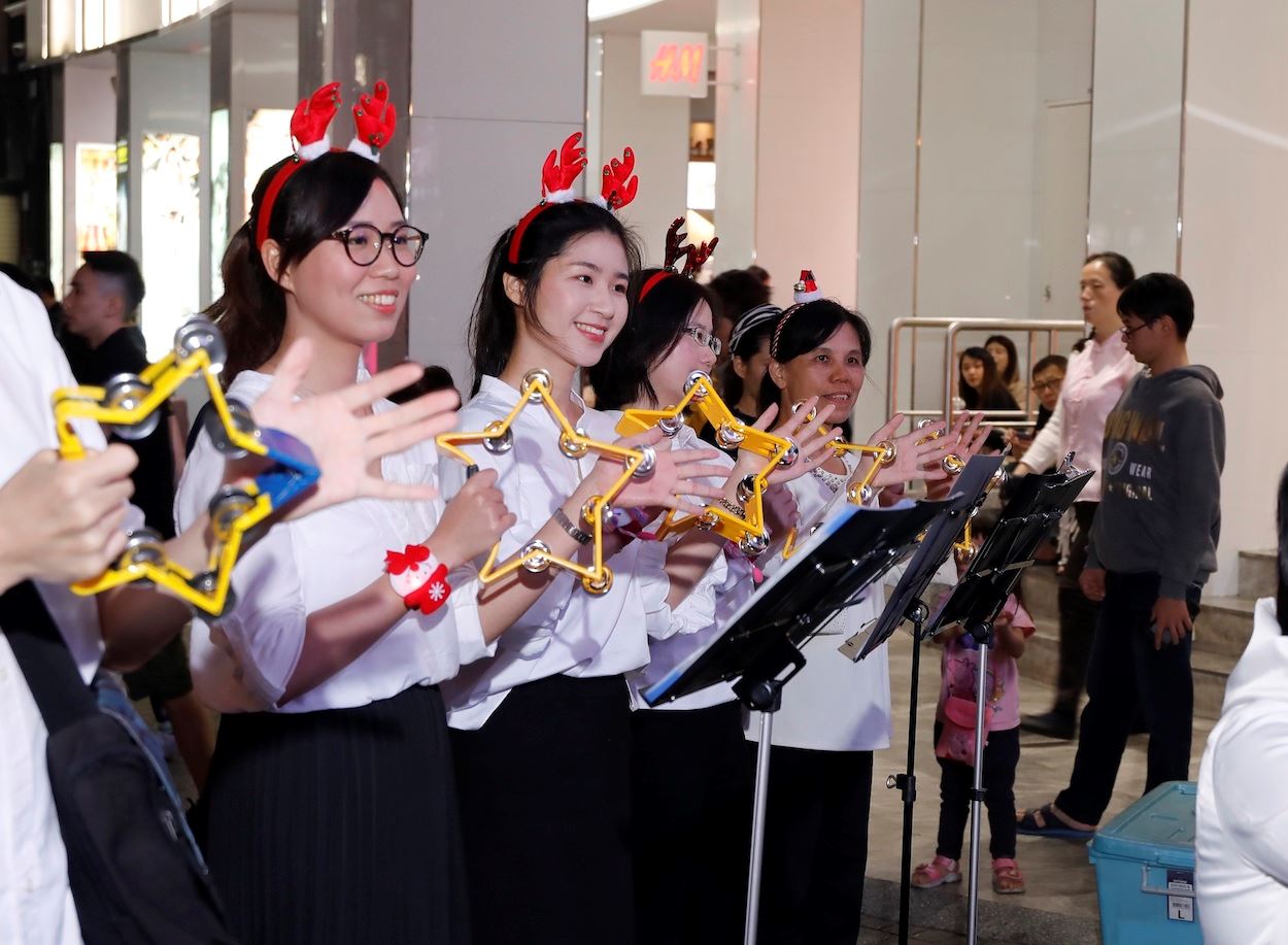 ![]() 图3~4:节日期间,西门景点的法轮功学员们穿戴佳节服饰,以音乐会的形式与民众互动、传递法轮大法的善良和美好。 |