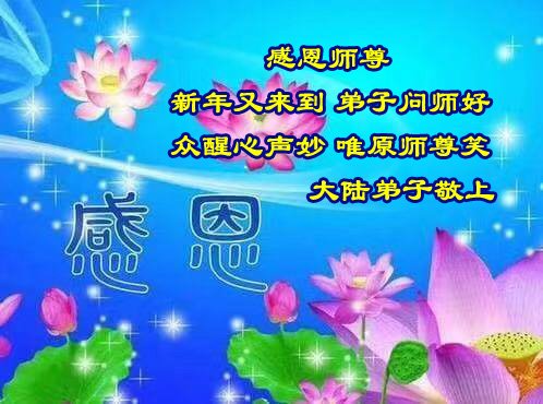 慈悲的师父新年好!内蒙古教育系统大法弟子遍布各个盟市,在发挥着各自所长,默默的做着三件事,兑现着誓约。新的一年我们将更加用心,走好每一步,不辜负师父在芸芸众生中选择了我们。又一个新年来了,弟子们在此共同遥祝恭贺师父新年好!叩首合十